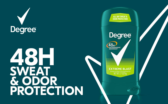 Degree Men Extreme Blast Antiperspirant Deodorant delivers 48-hour sweat and odor protection to keep you feeling dry and fresh. This antiperspirant deodorant for men works as hard as you do and offers 48-hour protection, so you can take on the day. Our Extreme Blast Antiperspirant Deodorant features a refreshing kick of crisp, citrus freshness. The powerful antiperspirant deodorant responds when you need it most, so you can stay confident without having to worry about slowing down. You can be confident you’ll be protected from sweat and odor by this antiperspirant for men. Stay fresh and feel clean from morning to night. Simply twist, glide and get moving. The crisp, energizing scent helps to keep you as fresh as when you started your day. Stay dry, cool, and confident thanks to Degree Men Extreme Blast Antiperspirant Deodorant. At Degree, we want to inspire the confidence in everyone to move more and go further. We’re here to support your journey through an antiperspirant that moves with you and helps you go beyond your limits. As well as increasing our use of reusable materials, we’re making it easier for you to recycle our antiperspirant and dry spray packaging. Degree. It won’t let you down.