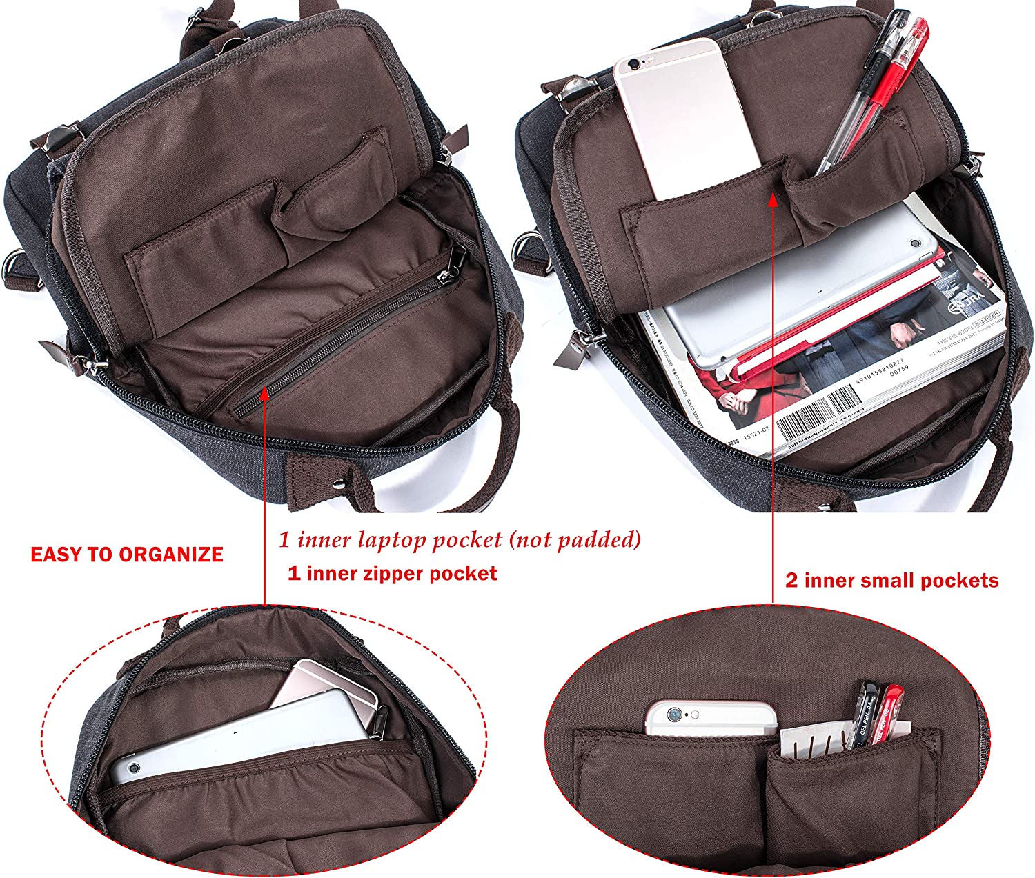 The canvas backpack is vintage and multifunctional with lots of pockets. 1 zipper pocket is in the front flap; 1 zipper pocket and 1 open pocket are under the flap; 2 side pockets. The main compartment is fitted with two zip heads and pulls: 1 inner zipper pocket; 1 inner laptop pocket; 2 inner small pockets. A small laptop, iPhone, wallet, snacks, tickets and magazine will all fit comfortably with room left over for add-ons.