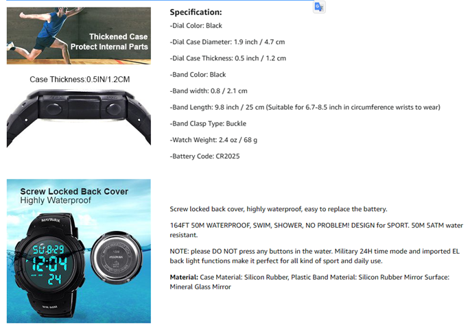 Thickened case to protect its internal parts. Anti-drop and not easy to be worn-out. Square concavesymmetry design, with the overall black color matching, it is of very cool sports style and personality.Specification:Dial Color: Black DialCase Diameter: 1.9 inch / 4.7 cmDial Case Thickness: 0.5 inch / 1.2 cmBand Color: BlackBand width: 0.8 / 2.1 cmBand Length: 9.8 inch / 25 cm(Suitable for 6.7-8.5 inch in circumference wrists to wear)Band Clasp Type: BuckleWatch Weight: 2.4 oz / 68 gBattery Code: CR2025Screw locked back cover, highly waterproof, easy to replace the battery.164FT 50M WATERPROOF, SWIM, SHOWER, NO PROBLEM! DESIGN for SPORT. 50M 5ATM water resistant.NOTE: please DO NOT press any buttons in the water. Military 24H time mode and imported EL back light functions make it perfect for all kind of sport and daily use.Material: Case Material: Silicon Rubber, Plastic Band Material: Silicon Rubber Mirror Surface: Mineral Glass MirrorErgonomic recess and rattlesnake tail-like texture with square hole band design. While accelerating perspiration,it is of strong three-dimensional sense. Loops also consolidate stability of the strapLarge numbers on the dial and with EL Backlight, easy to read, suitable for viewing in dark environment, very convenient.Multi-functional buttons, simple structure, easy to operate.High quality material makes it lightweight and comfortable to wear.