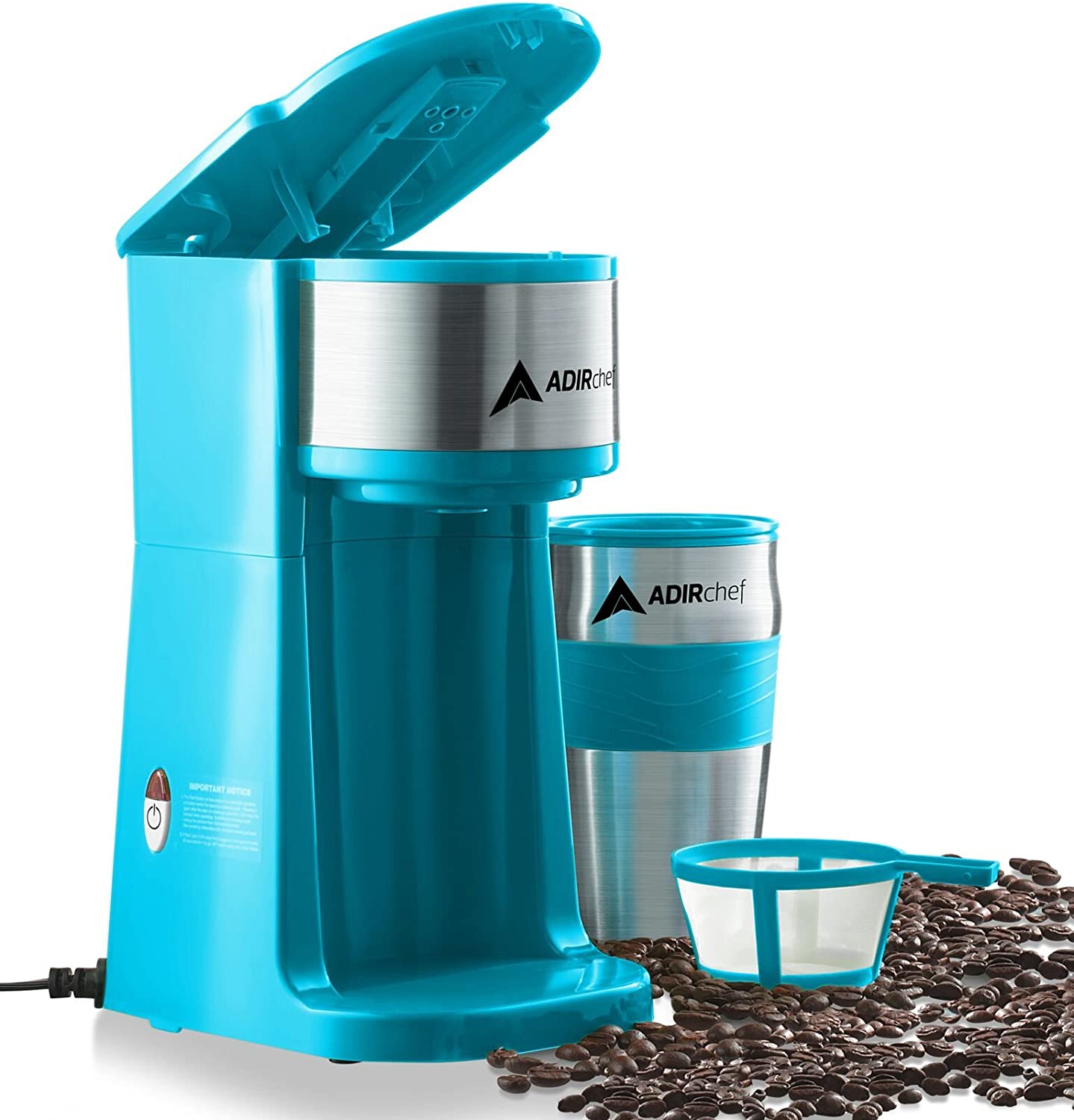 AdirChef Mini Coffee Maker - Single Serve Coffee Maker, 15 oz. Travel Coffee Mug Coffee Tumbler & Reusable Coffee Filters - Ideal for Home, Office, Outdoor & More - Blue