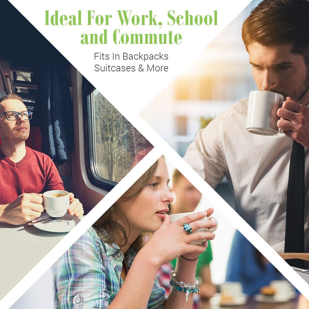 PORTABLE APPLIANCE. Small and lightweight, this unit is the perfect size for tight counter spaces or tiny cubicles in the workplace and can be easily transported from one location to the next. In addition, the mug is equipped with a comfort grip Band and is tapered to fit most vehicle cup holders. If you prefer to set up the appliance in your kitchen permanently, you can just grab the mug and take your coffee to go. It is also a great father's day gift.