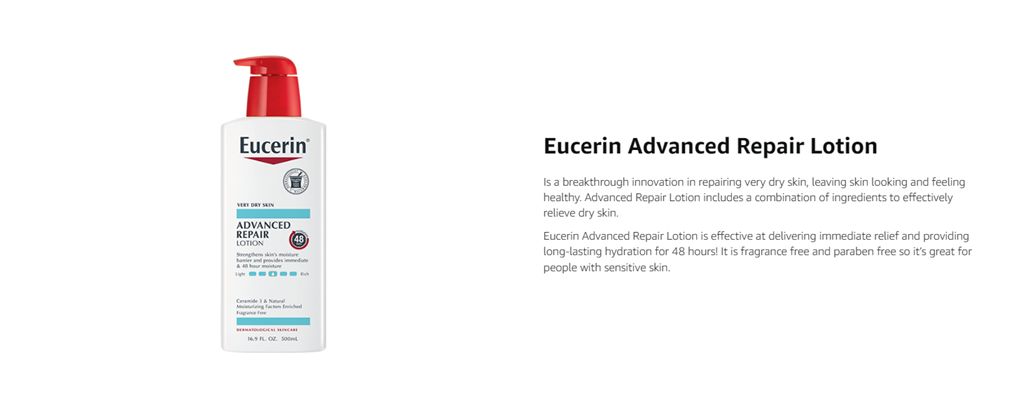 Fight dryness at its source with Eucerin Advanced Repair Body Lotion. This Eucerin lotion for dry skin provides 48 hour moisture for skin that looks and feels healthy. Eucerin Advanced Repair Body Lotion for dry skin is formulated with ceramides to help strengthen the skin’s moisture barrier to lock in moisture. It is also formulated with Natural Moisturizing Factors, amino acids that are naturally found in the skin, to boost moisture and help prevent dryness. This Eucerin sensitive skin lotion formula is lightweight and fast-absorbing, and smoothes, repairs and hydrates dry skin. This Eucerin body lotion for sensitive dry skin is fragrance free, dye free, paraben free. This body moisturizer can also be used as a hand lotion or foot lotion. To use, smooth this Eucerin dry skin lotion onto your skin daily. For best results, apply after showering. Eucerin is a dermatologist-recommended skincare brand that is based on an uncompromising approach to science. With skin care products designed to restore and sustain healthy-looking skin, families everywhere look to Eucerin to enhance outer beauty and self-confidence.
