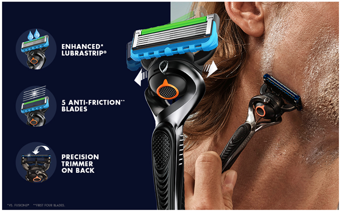 The Gillette ProGlide men's razor with FlexBall technology responds to your contours giving you uncompromising closeness and comfort. The handle’s FlexBall technology responds to contours and the blade refill features 5 antifriction blades for a shave you can barely feel. The blades are spaced closely together for incredible comfort with a precision trimmer on the back for hard to reach places and for styling your facial hair just the way you want it. The enhanced lubrastrip (vs. Fusion5) has more lubricants for comfort and glide. This enhanced lubrastrip also fades when you are no longer getting an optimal shave. Soft microfins gently stretch and smooth your skin to prepare hairs for a close shave while a microcomb helps guide your hair for a close shave from our thinnest blades. The ProGlide razor for men features our sharpest blades (first 4 blades) which help get virtually every hair effortlessly. One razor blade refill lasts up to one month of shaves. All ProGlide blade refills can fit all Gillette 5 blade razor handles (excluding GilletteLabs).