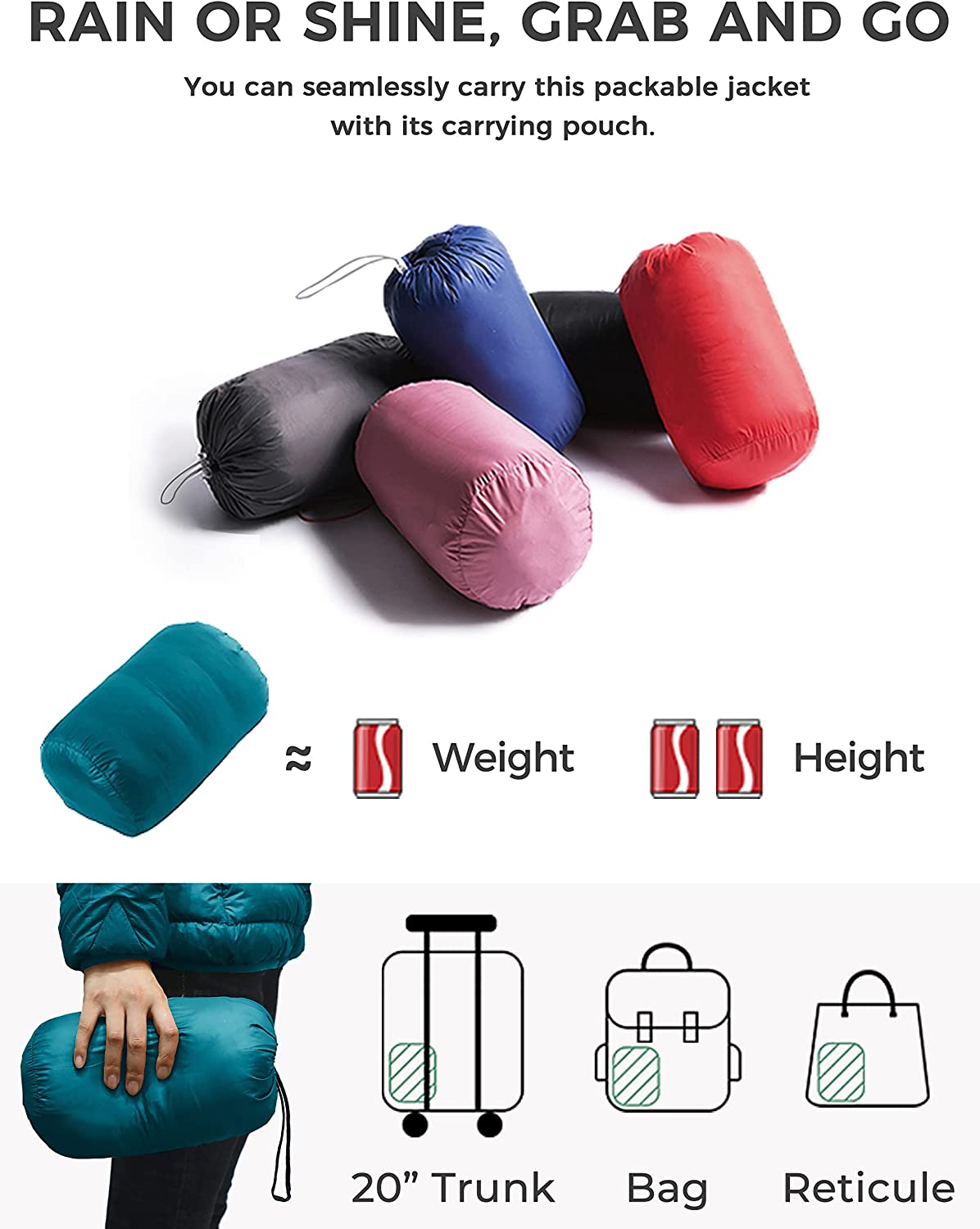 • Travel in Style - Made of 20D 400T nylon, our stylish, compressible, and the lightweight puffer coats are ideal for on-the-go use with this packable down jacket's carrying pouch-perfect to bring on travels and commutes.