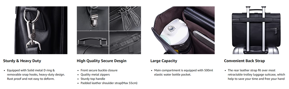- Feature Detail: Adjustable and removable shoulder strap; well constructed handle; strenght stitching, luggage belt on the back. Great for college, work, business, office, weekender, short time business travel and so on.