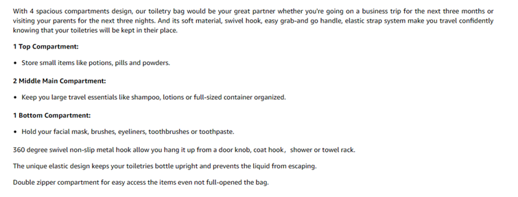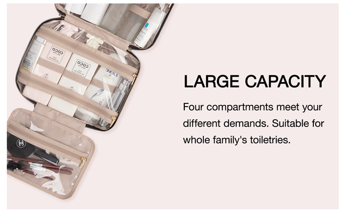 • Large Capacity - 12.6 x 9.1 x 4.3 inch (rolled); 12.6 x 33.5 inch(open) 4 separate compartments with zip and back open pocket for great organization. Suitable for your family trip to pack all men, women and kids toiletries.