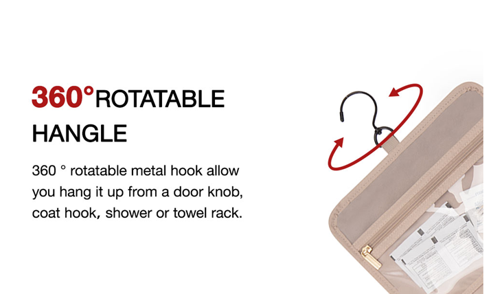 • Convenient Design - Stow-away 360 degree swivel non-slip metal hook for versatile hanging options; Two-way zipper closure for quick access; Carry handle doubles as its hanging strap.