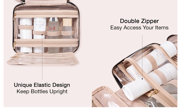 • Special Design - Inner main pockets with elastic straps hold bottles upright; Double zipper compartment for easy access the items even not full-opened the bag; Transparent sides for providing clear overview of contents.