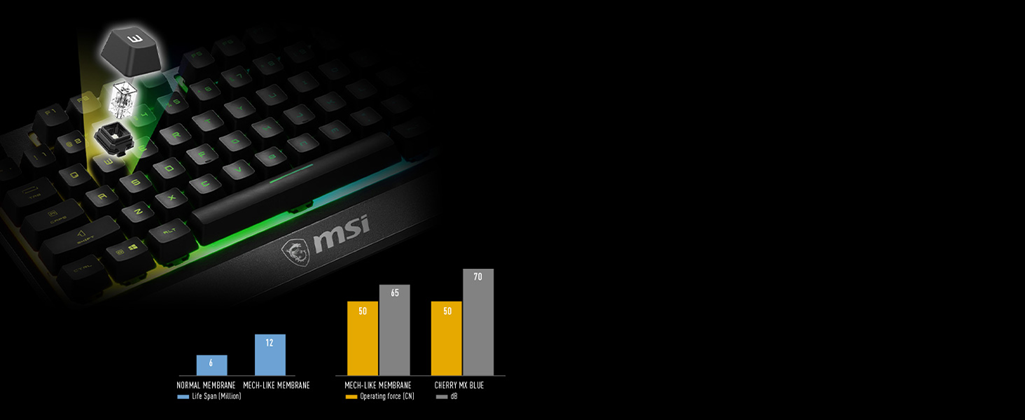 • Stunning 6 Zone RGB Lighting: Make your keyboard yours. Customize 6 different zones with your own custom colors or use one of the presets with the setting keys or RGB Mystic Light.