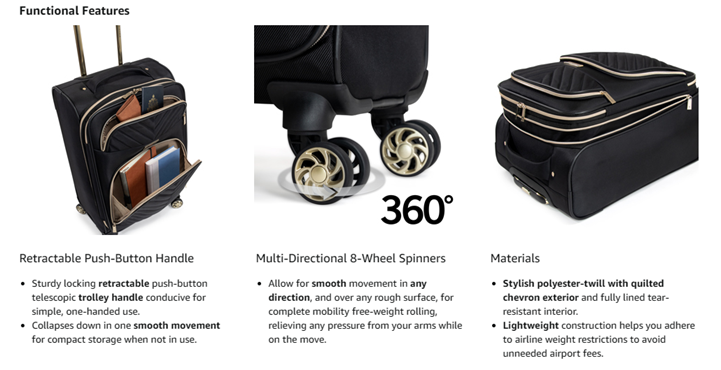 Finally, travel made trendy with the stylish polyester-twill chevron luggage from Kenneth Cole Reaction’s Chelsea luggage collection. Complete with a fully lined, tear-resistant interior, this luggage also expands an additional 2.0 inches, ensuring that you have plenty of space for all your needed belongings. Its lightweight construction helps you meet airline weight restrictions to avoid unnecessary airport fees, while its 8-wheel spinners provide effortless 360-degree navigation allowing you to glide quickly through the airport. The main compartment interior features a hanging side zipper pocket and garment restraints to hold belongings in place. The under-the-lid section includes a mesh zipper pocket and a transparent, clear PEVA gusseted pocket for toiletries. The front exterior also features a small zipper pocket for easily accessible items and a large gusseted zipper pocket for additional storage organization. Padded top and side handles allow for easy maneuvering, and a bottom grab handle allows for easier lifting. Additionally, a retractable trolley handle extends to be 41 inches tall with a locking push button mechanism. Fashionable and functional, Chelsea luggage also boasts fashion-forward gold hardware with premium self-repairing coil zippers designed for long-lasting use. Carry-on size meets most U.S. based airline carry-on size requirements and fits into most airline overhead bin compartments. Backed by a manufacturer 10-year limited warranty. ★ Overall Dimensions: 22.0” H” x 14.0” L x 9.0”-11.0” D. ★ Packing Dimensions: 20.0” H x 13.5” L x 8.5”-10.5” D. ★ Weight: 6.35 lbs. ★