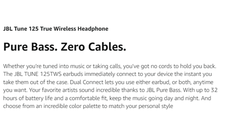 JBL Tune 125TWS True Wireless In-ear Headphones Pure Bass. Zero Cables with the JBL Tune 125WS. Immerse yourself in your world. Whether you’re tuned into music or taking calls, you’ve got no cords to hold you back. Just wear the JBL Tune 125TWS earbuds to start feeling the sound, as they immediately connect to your device the instant you take them out of the case. Dual Connect lets you use either earbud, or both, anytime you want. Your favorite artists sound incredible thanks to JBL Pure Bass. With up to 32 hours of battery life and a comfortable fit, you can keep the music going all day and night. Choose from the incredible color palette to find the true wireless headphones to match your personal style. True Wireless Headphones, JBL Pure Bass Sound, Up to 32 hours Battery life, Fast Pair enabled by Google, Dual Connect, Comfortable and Hands-free calls with voice assistant For over 70 years, JBL has engineered the most precise, impressive sound found in big venues around the world. Harman's mission and vision is to make life more connected, entertaining, personalized and productive. The company combines passion and purpose to design smart products systems, software and services to connect people wherever they are.