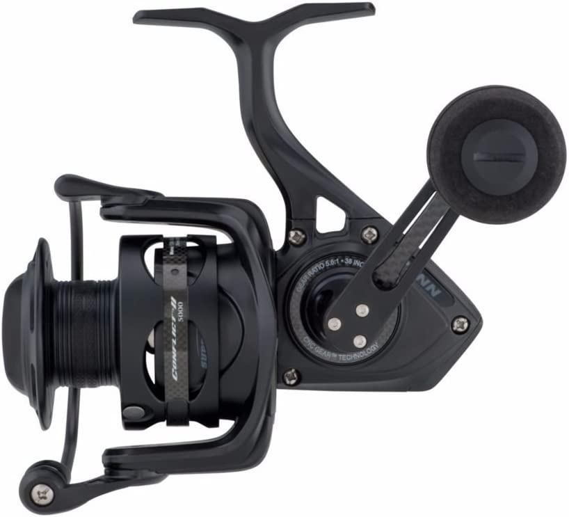 The PENN Conflict II features stealthy cosmetics, a Lightweight design (our lightest spinning reel ever), and silky smooth HT-100 drag. The RR30 Rigid Resin body and rotor are extremely lightweight and durable. Internally the Conflict II is powered with our CNC Gear Technology, and high quality stainless steel ball bearings. With the Super line Spool no backing is needed because of the rubber gasket that keeps superliner from slipping. .