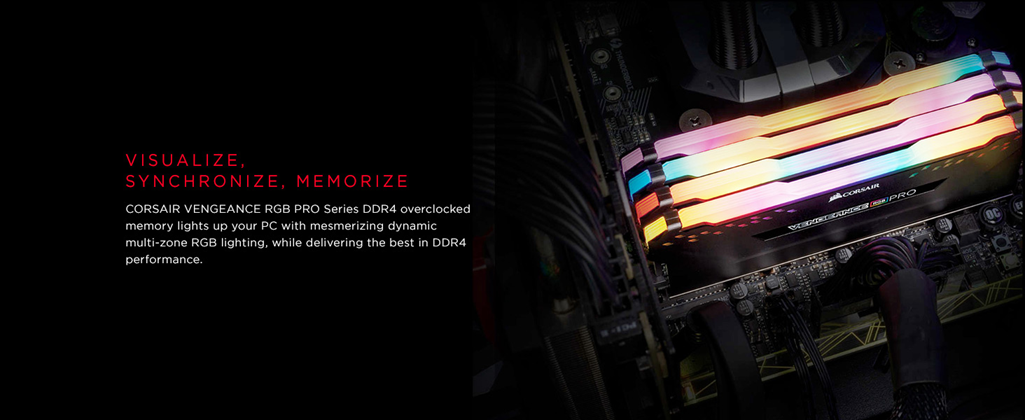CORSAIR VENGEANCE RGB PRO Series DDR4 memory lights up your PC with mesmerizing dynamic multi-zone RGB lighting, while delivering the best in DDR4 performance and stability. Every module boasts ten individually controlled RGB LEDs, while wire-free design makes installation simple. Take control with CORSAIR iCUE software and completely customize every module’s lighting to match your system, or easily synchronize lighting across all your CORSAIR products with Light LINK. A custom designed PCB provides the highest signal quality for the best level of performance and stability on the latest AMD and Intel DDR4 motherboards, while specially screened ICs unlock superior overclocking.