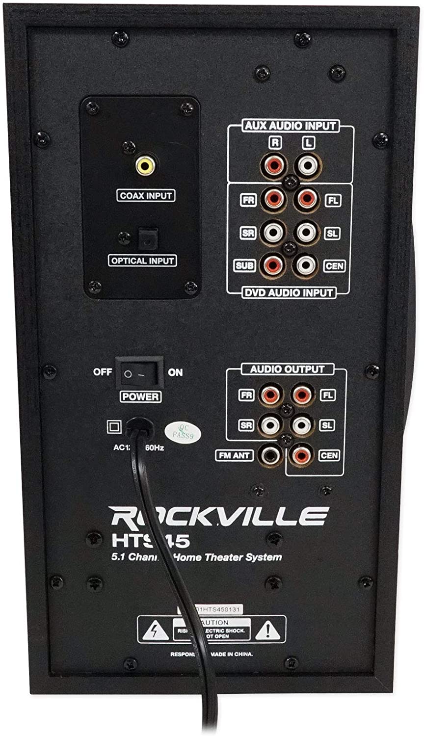 Rockville HTS45 800w 5.1 Channel Bluetooth Home Theater Audio System+Subwoofer. 800 Watts Peak Power. 400 Watts Program Power. 200 Watts Continuous RMS Power. 5.25” Subwoofer with Built-In Receiver. 3” Center Channel Speaker. 3” Full Range Front Speakers. 3” Full Range Rear Channel Speakers. Top Quality MDF Wood Cabinets with Plastic Front Panels. Built-In FM Receiver with Amazing Reception. 5 Preset Equalizer curves. You can independently control the volume of each speaker and the subwoofer. Bluetooth v5.0. Optical Input. Coaxial Input. USB Input (max file size 64Gb). SD Input (max file size 64Gb). 2 ¼” MIC Inputs with Echo function for karaoke. 5 RCA Audio Outputs connect to the 5 speakers