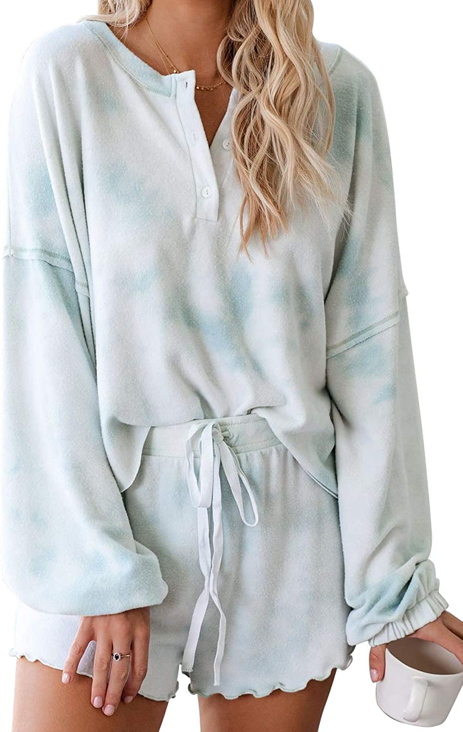 2 Piece Pajama sets featued ruffle short lounge wear, button down v neck and bright solid color pajamas make more fashion and give you a pretty and cute look