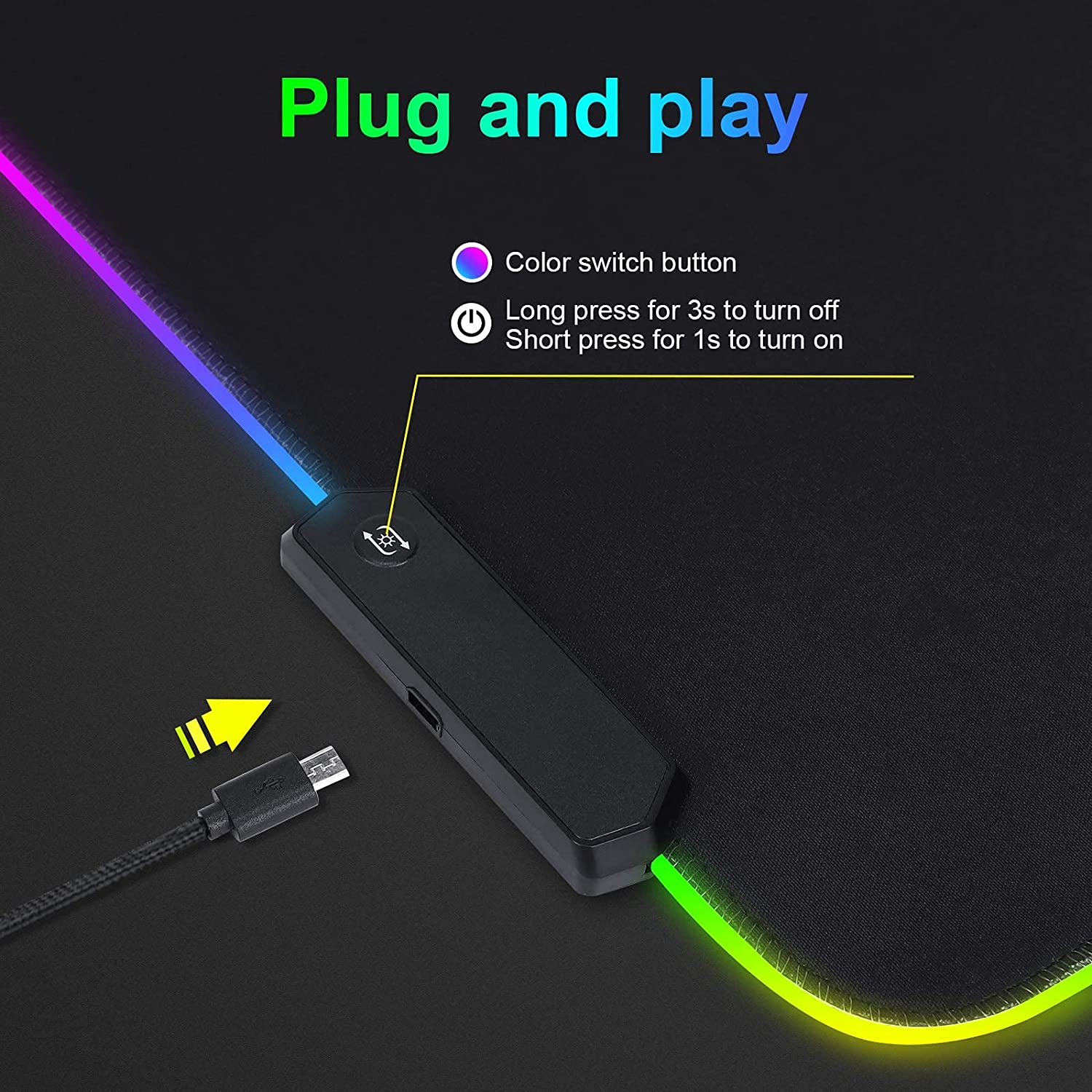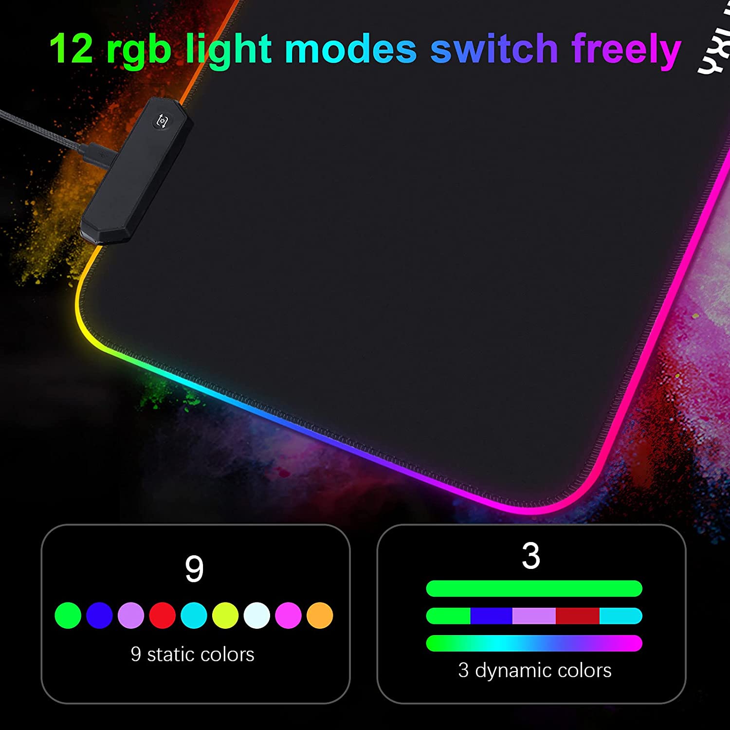 • 【 12 RGB Lighting Modes】 This extra-thick RGB gaming mouse pad features 9 static light modes and 3 dynamic modes.Just easily click the switch button to change colors, choose from 12 lighting modes, Breath, RGB flash, Neon Lighting, Green, Blue,Light Purple ,Red, Light Blue,Yellow,White,Purple,Orange.