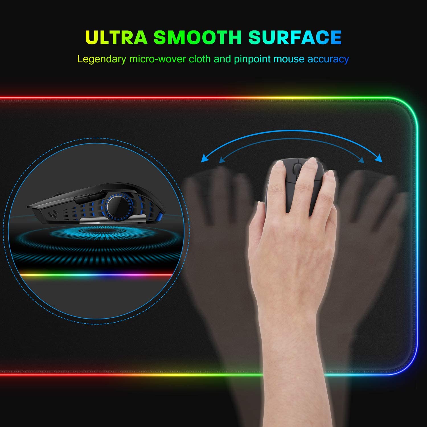 • 【 Ultra-Smooth & Waterproof Surface】 The RGB Gaming Mouse Pads design with superfine fiber braided material which are micro-textured, smooth surface, precise navigation without warped, so the mouse could moves seamlessly across the pad and then the cursor follows the mouse precisely. Waterproof design, even if you sprinkle water, tilt the mouse pad to pour out the drops.