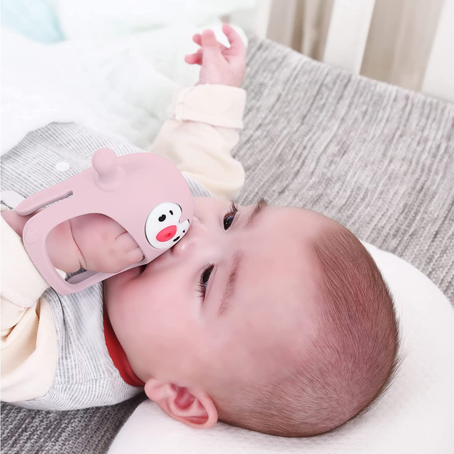 【SAFE MATERIAL & SAFE DESIGN】: The baby teether is made of food grade silicone by US FDA verifided manufacturer. Stays on baby’s hand makes sure the breast-shaped part do not flip over to prevent suffocation. No chemical stuff add in the teether to make sure it is 100% safe.No odd smell, no potential small parts. It is dishwasher safe, freezer safe. Its non-choking design ensures baby not be able to put it too far behind to cause gag.