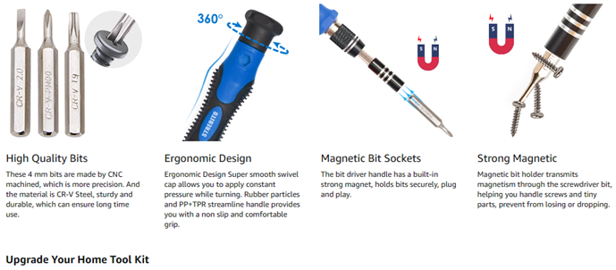 - 【Humanized Design】The small screwdriver kit has been upgraded for maximum humanization, makes your repair job easier and more efficient. Super smooth swivel cap allows you to apply constant pressure while rotating. The PP+TPR handle is ergonomic designed to provide comfortable grip and enough torque. Magnetic bit holder transmits magnetism through the screwdriver bit, helping you handle tiny screws and electronic parts