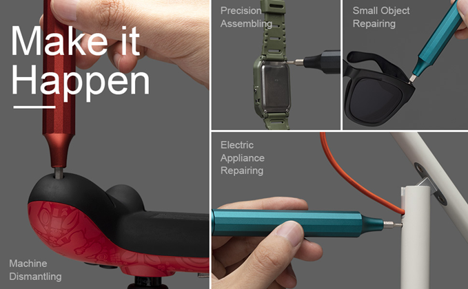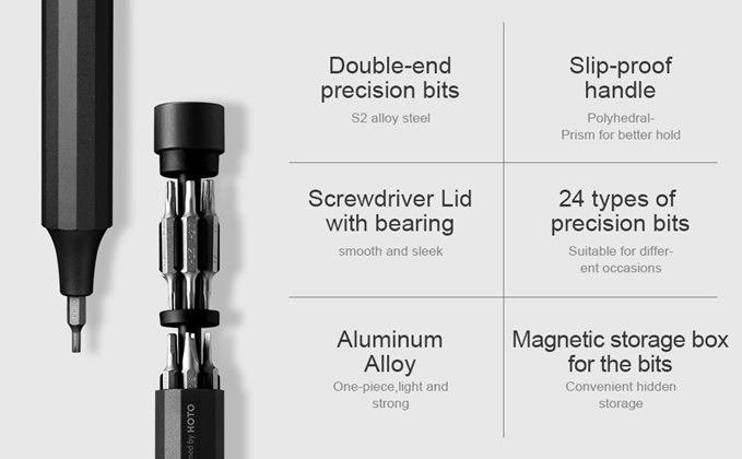 Included Components‎①Magnetic Storage box for precision bits; Portable pen-shape design. ②24 types of bits, Meet more high-precision repair needs; High-quality S2 Steel Precision Bits. ③Screwdriver lid with bearing and slip-proof handle, Suitable for single-handed usage. ④Magnetic Slot for Bits, Convenient for the quick change. ⑤Machine Dismantling; Electric Appliance Repairing; Precision Assembling; Small-Object Repairing. ⑥Weight: 150 g / Size: 12 cm x 1.7 cm x 1.7 cm. ⑦Material: Aluminum.