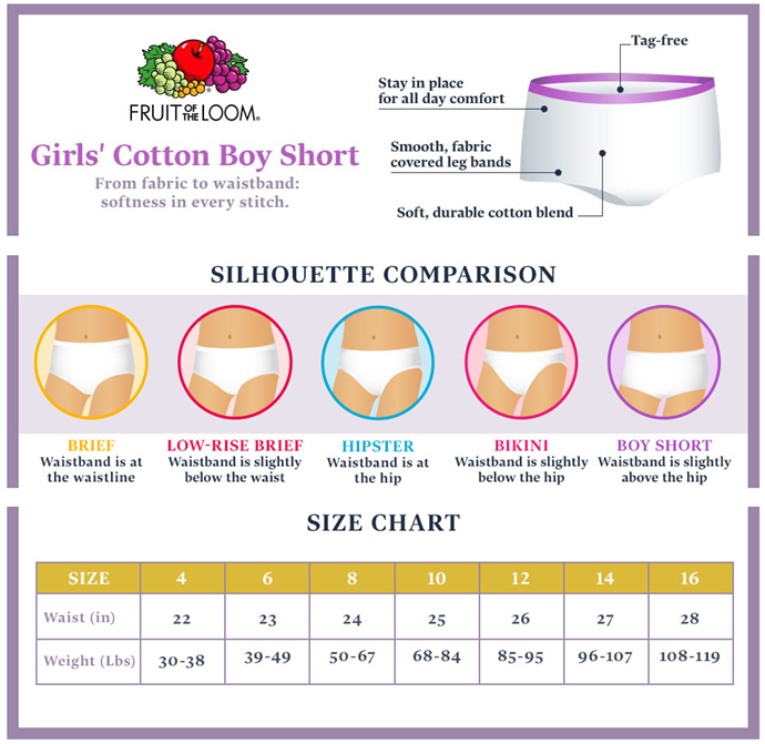 Introducing our improved cotton blend with extra softness, Fruit of the Loom girls' 14 pack boy short is an essential addition to her collection with this value pack size. This boy short is designed with a heather fabric and plush, no ravel waistband. The waistband sits at the hip, and the longer leg extends to the top of the thigh making this panty perfect for under dresses and skirts! This assortment includes a combination of cute prints and fashionable solids. Offering a colorful way to meet your basic clothing needs, these boy shorts come in a wide range of sizes making it easy to find the perfect fit for her. And since there are no irritating tags, this boy short is not only cute, but the ultimate in comfort!