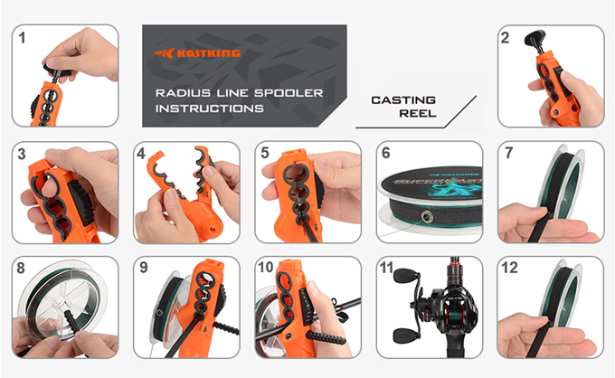 Kastking Radius line spooling tool has a unique compact design which gives you a quick and easy way to spool both casting reels and spinning reels without twisting the fishing line, and without removing the reel from your rod.