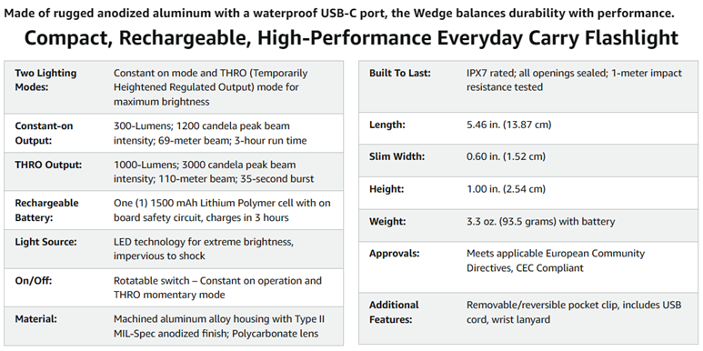 The Wedge is a compact high-performance EDC light, designed for clean pocket carry. Outfitted with an intuitive rotating thumb switch providing tactile control over the constant-on and THRO (Temporarily Heightened Regulated Output) modes. A waterproof USB-C port in the tail offers universal and convenient charging of the integrated lithium-ion battery. Switchable pocket clip allows for concealed carry in either pocket. Made of rugged anodized aluminum the Wedge balances durability with performance.