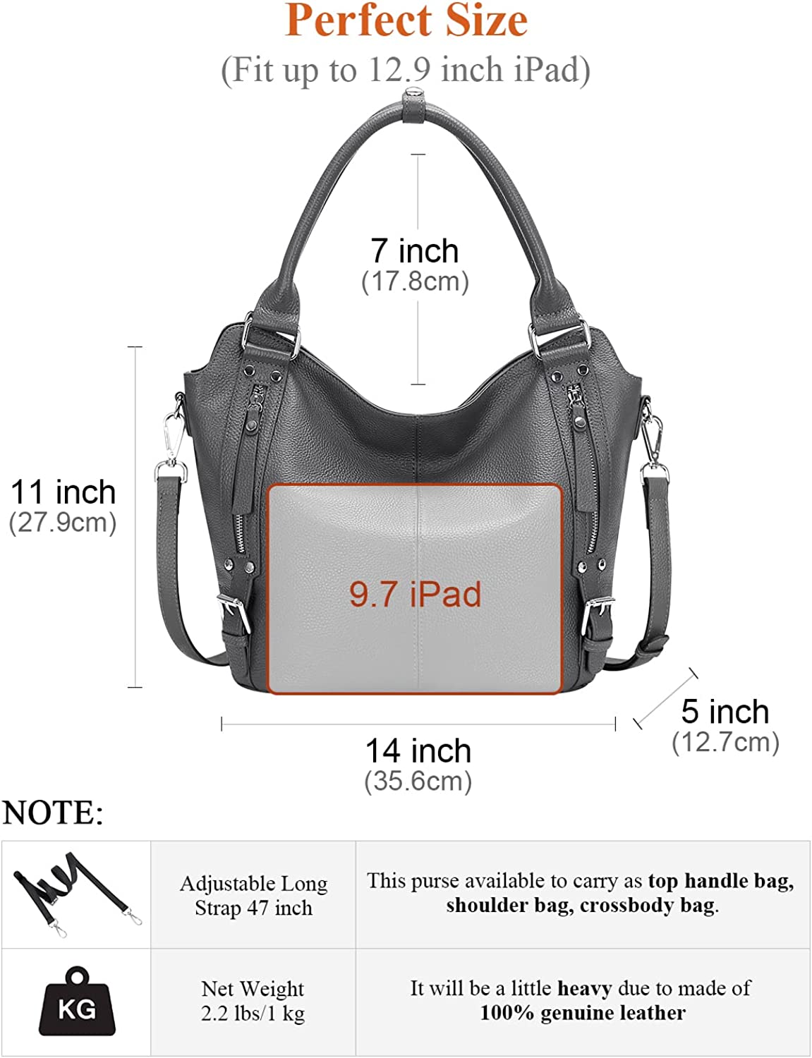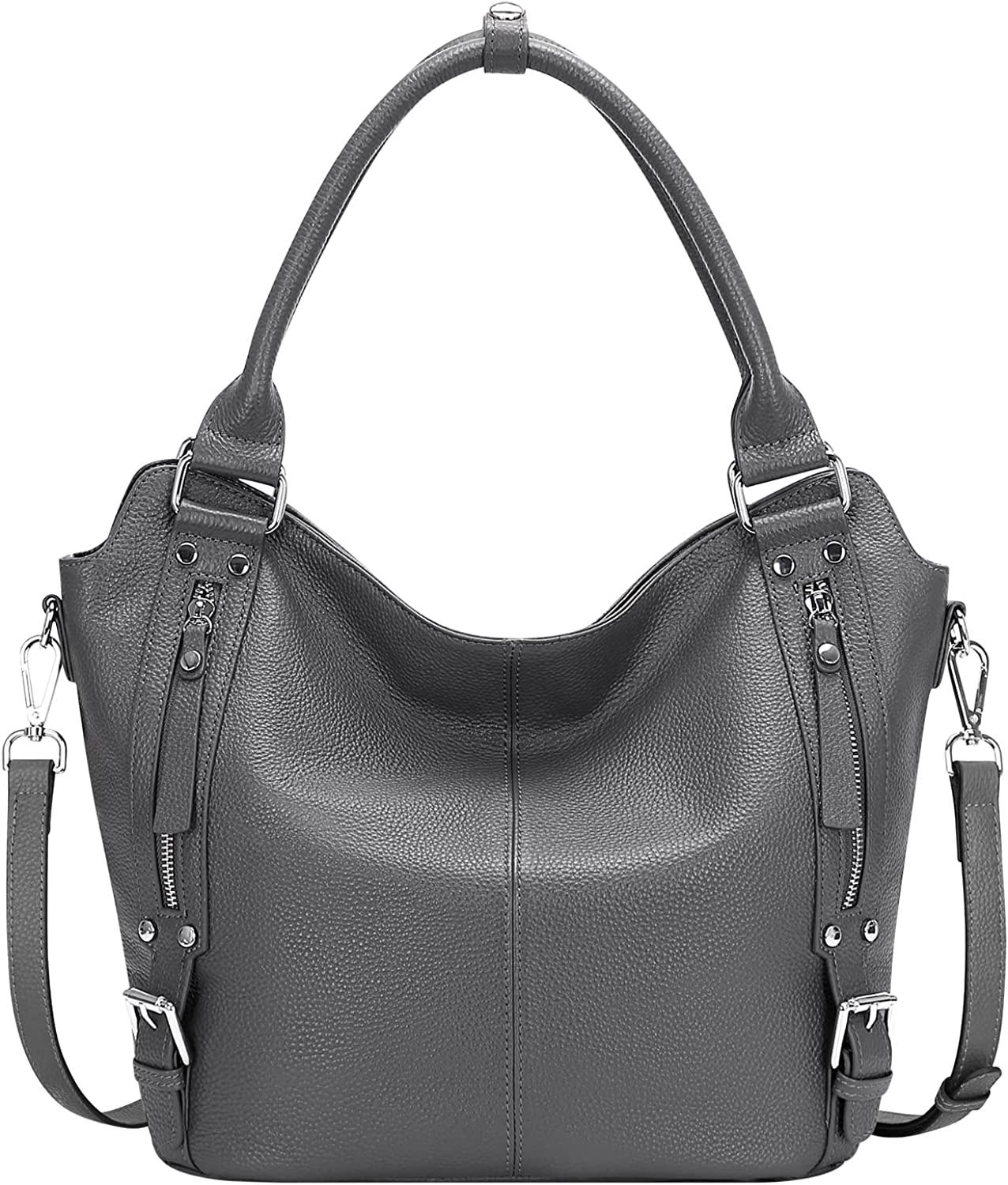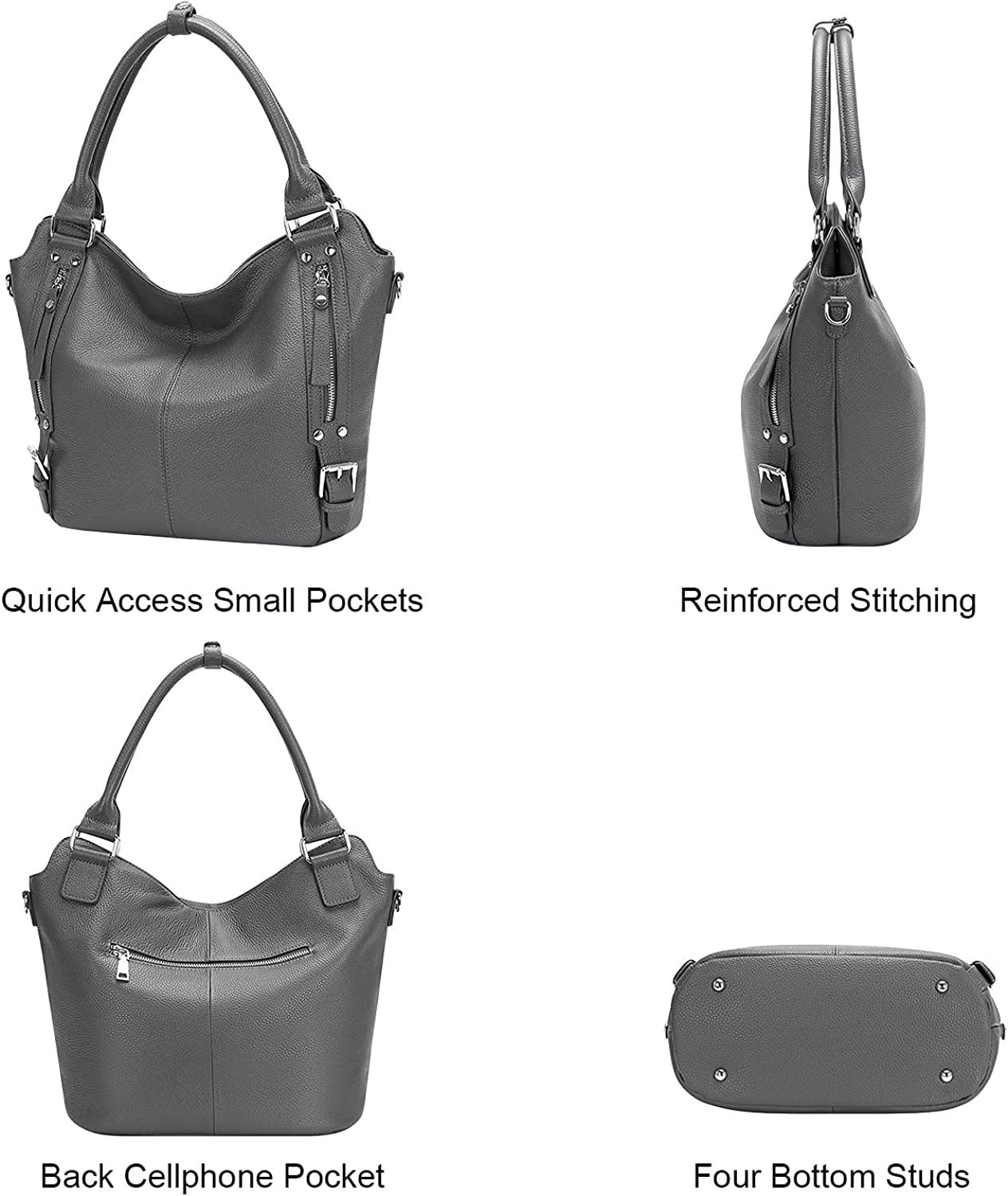 GENUINE LEATHER -- SOFT Leather large hobo tote purse made of genuine leather with pebble texture; The silver handware is high quality and durable. Bottom with 4 rivets for protecting your handbags bottom away from abrasion.