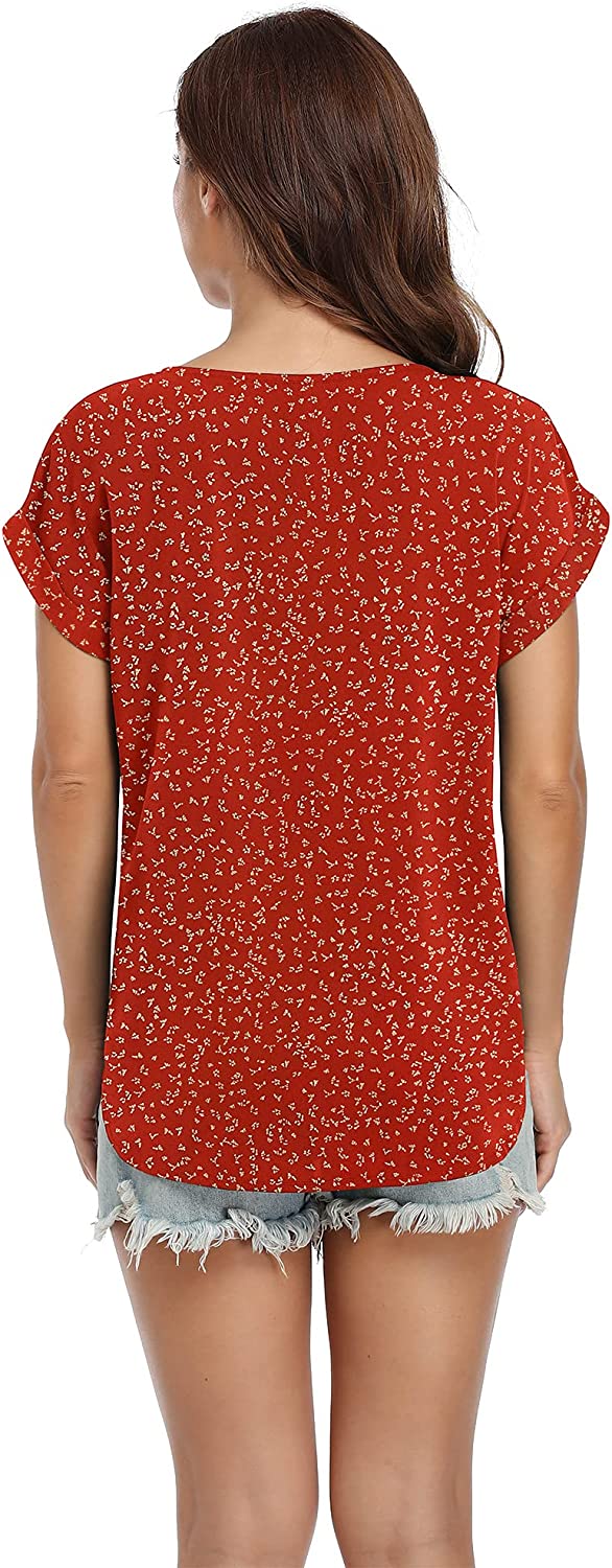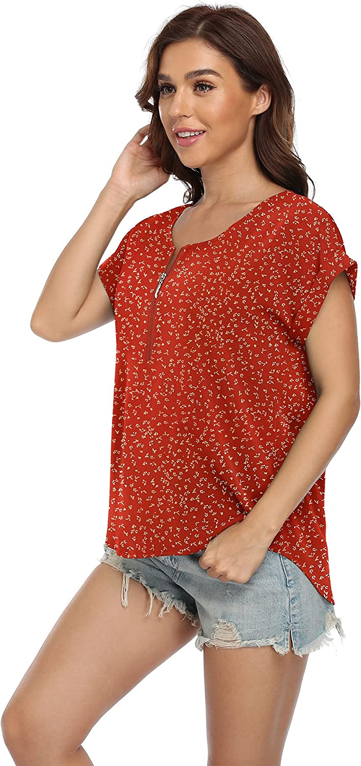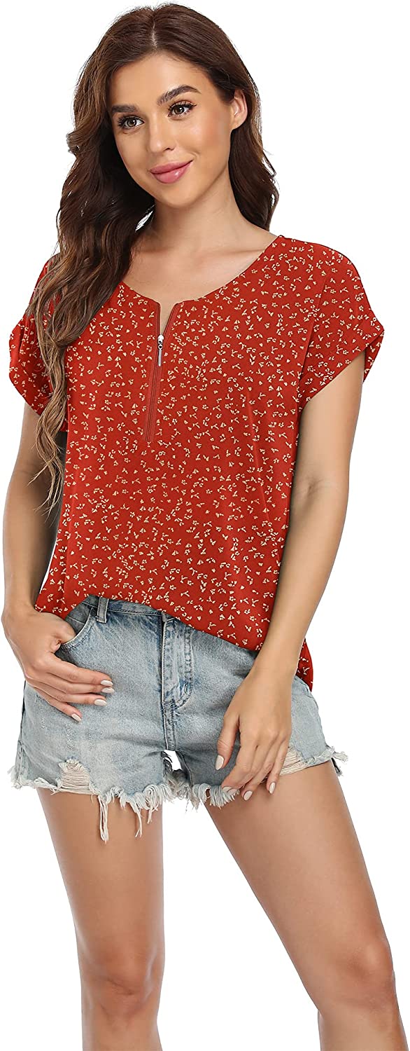 VIISHOW Women's Summer Casual Rolled Cuff Zip Half Placket Chiffon Short Sleeve Top Blouses