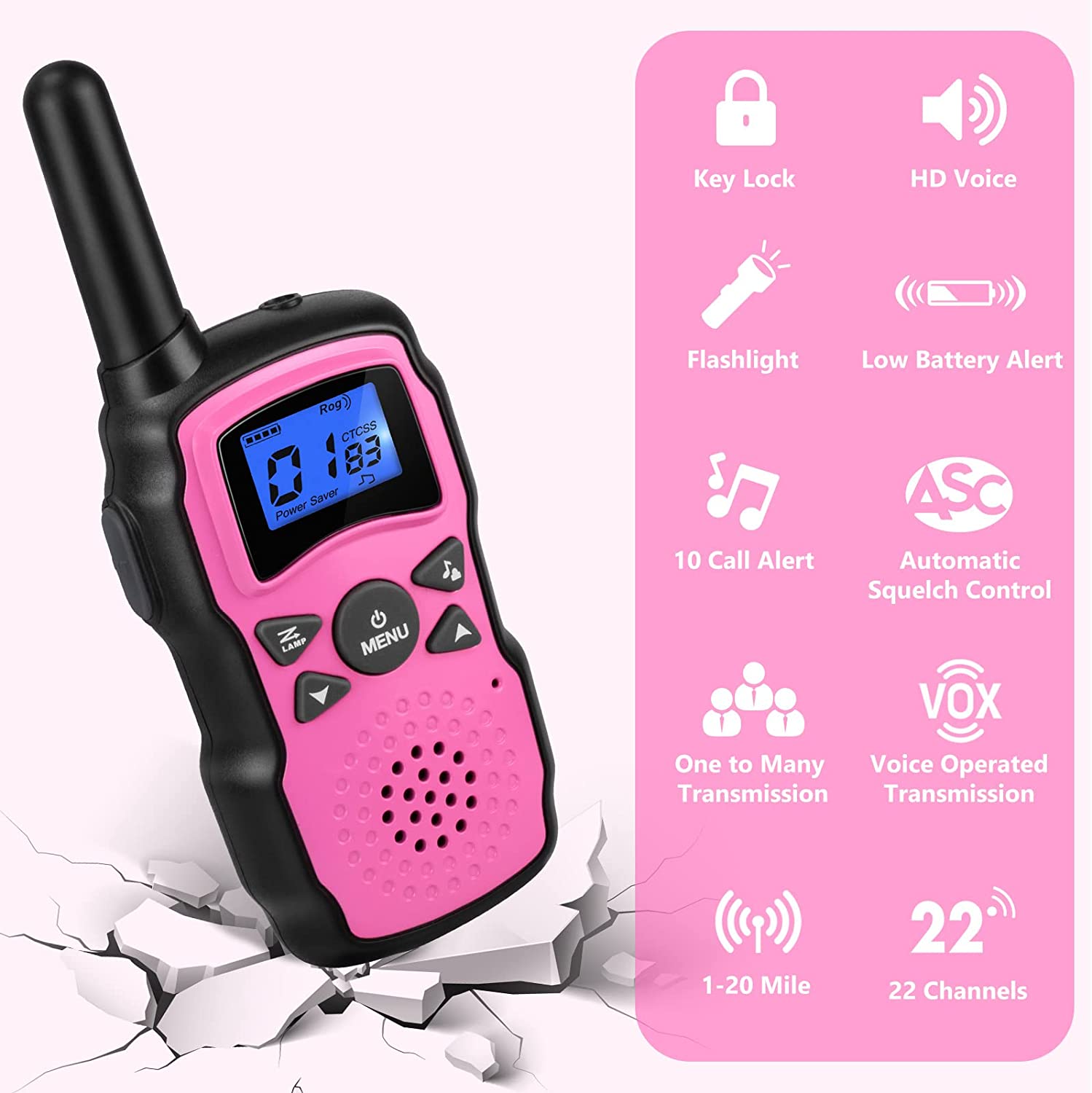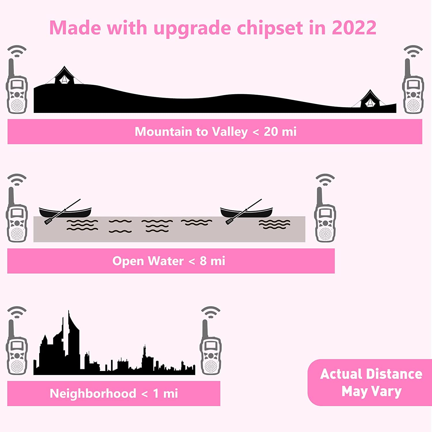 • ?【Long Range Radio Walkie Talkies】:The upgraded chipset greatly improved reception sensitivity and enhanced signal stability. Up to 1 mile in neighborhood, up to 20 miles in Mountain to Valley. You and your kids can enjoy a clear and fluent communication around the house and garden. The range in real conditions can be reduced from the maximum range
