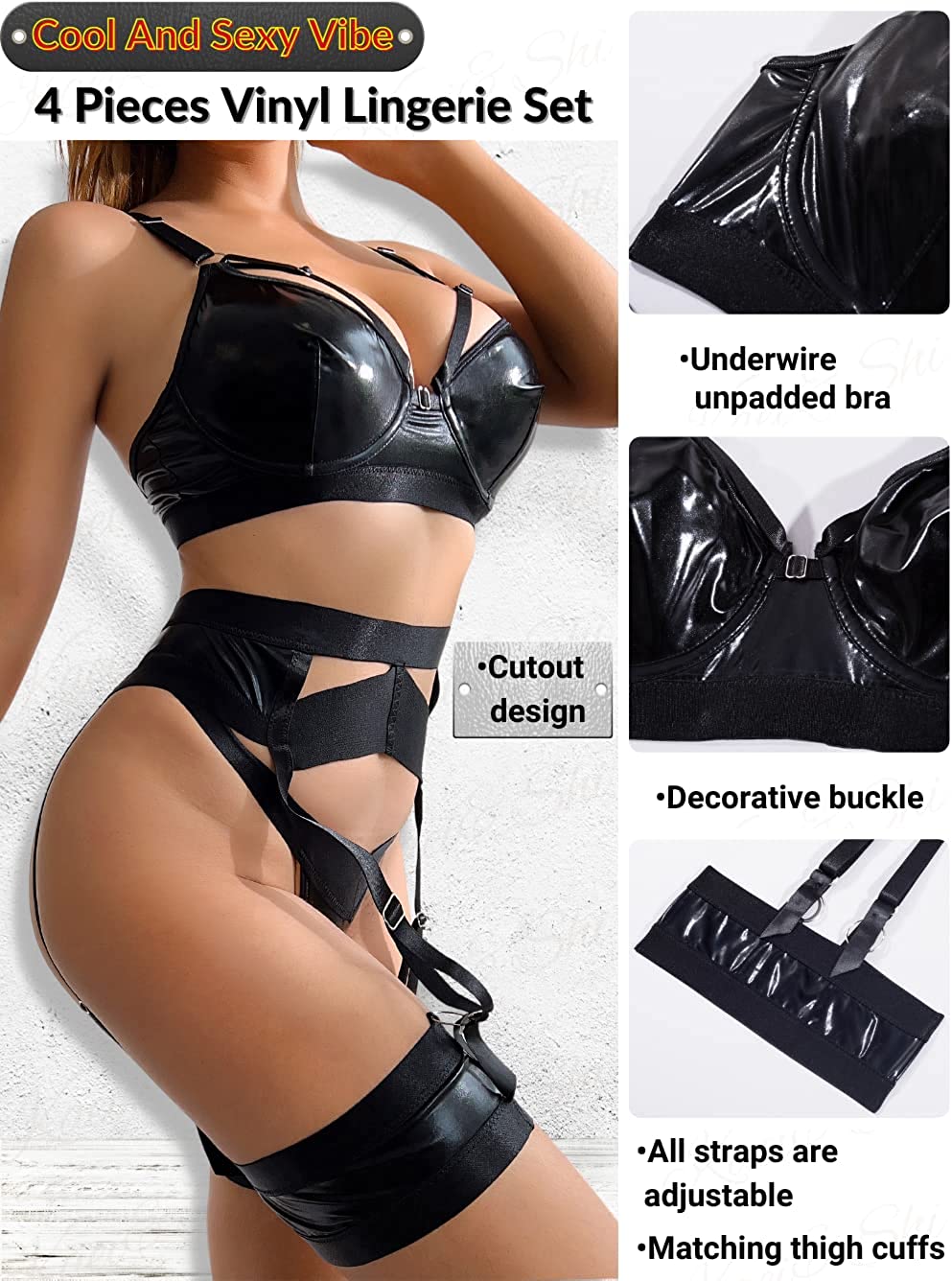 ✿Feature: This matching bra and panty set with belt and thigh bands is featured with strappy, high leg, metal ring, sheer mesh which shows your curve beautifully.