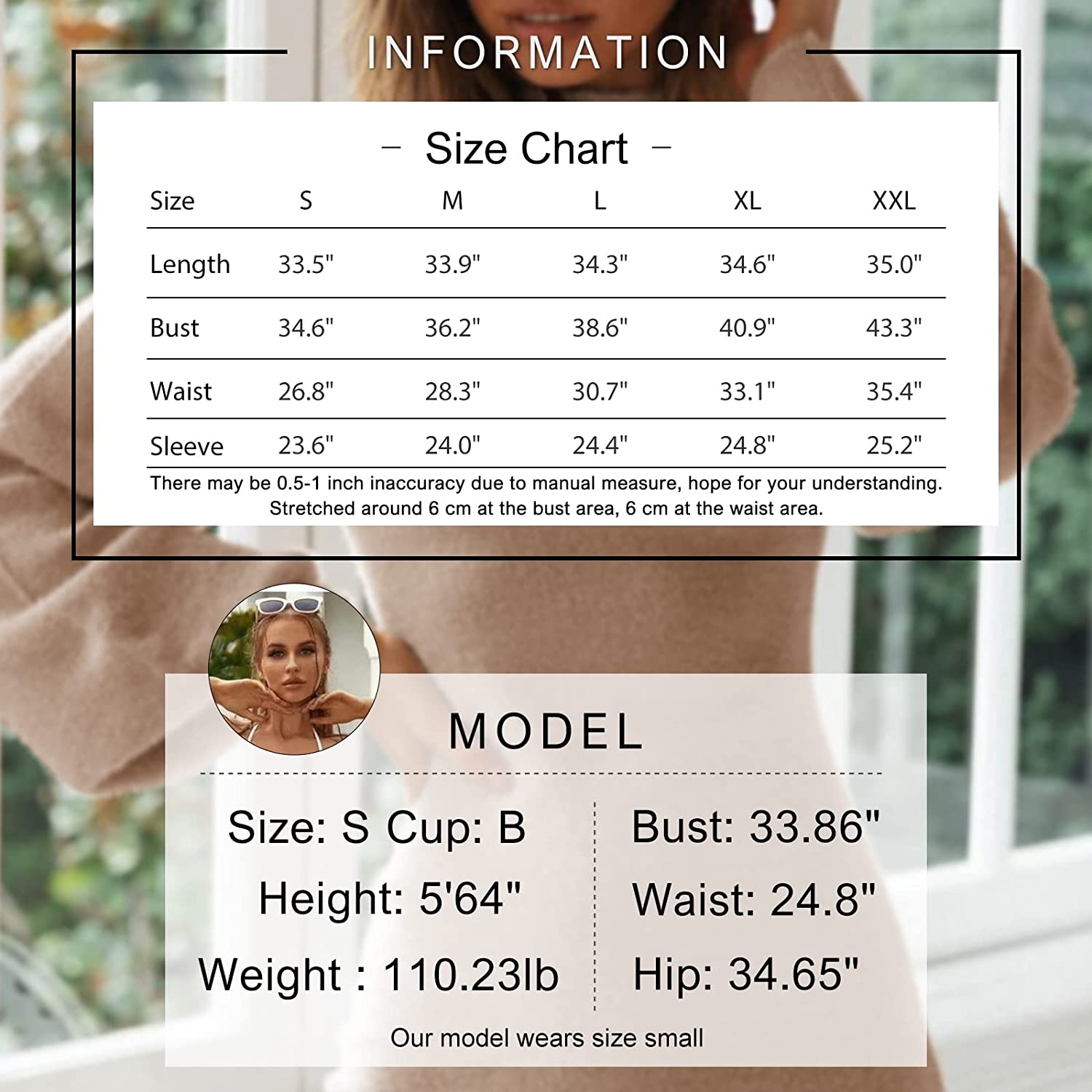 • Garment care: Sweater farbic, recommend hand wash in cold water or dry-clean, line dry, do not bleach.
