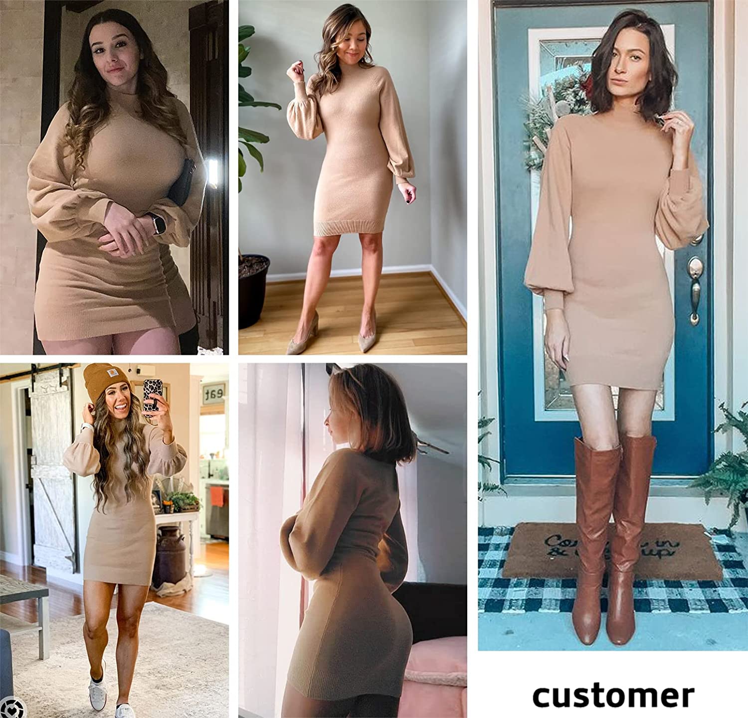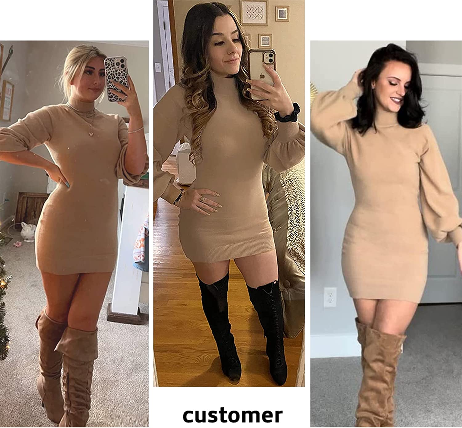 • Feature: Long puff sleeve style, mock neck, flattering slim fitted, chic bodycon sweater dresses, hits at mid thigh, body hugging. solid long sweaters dress.