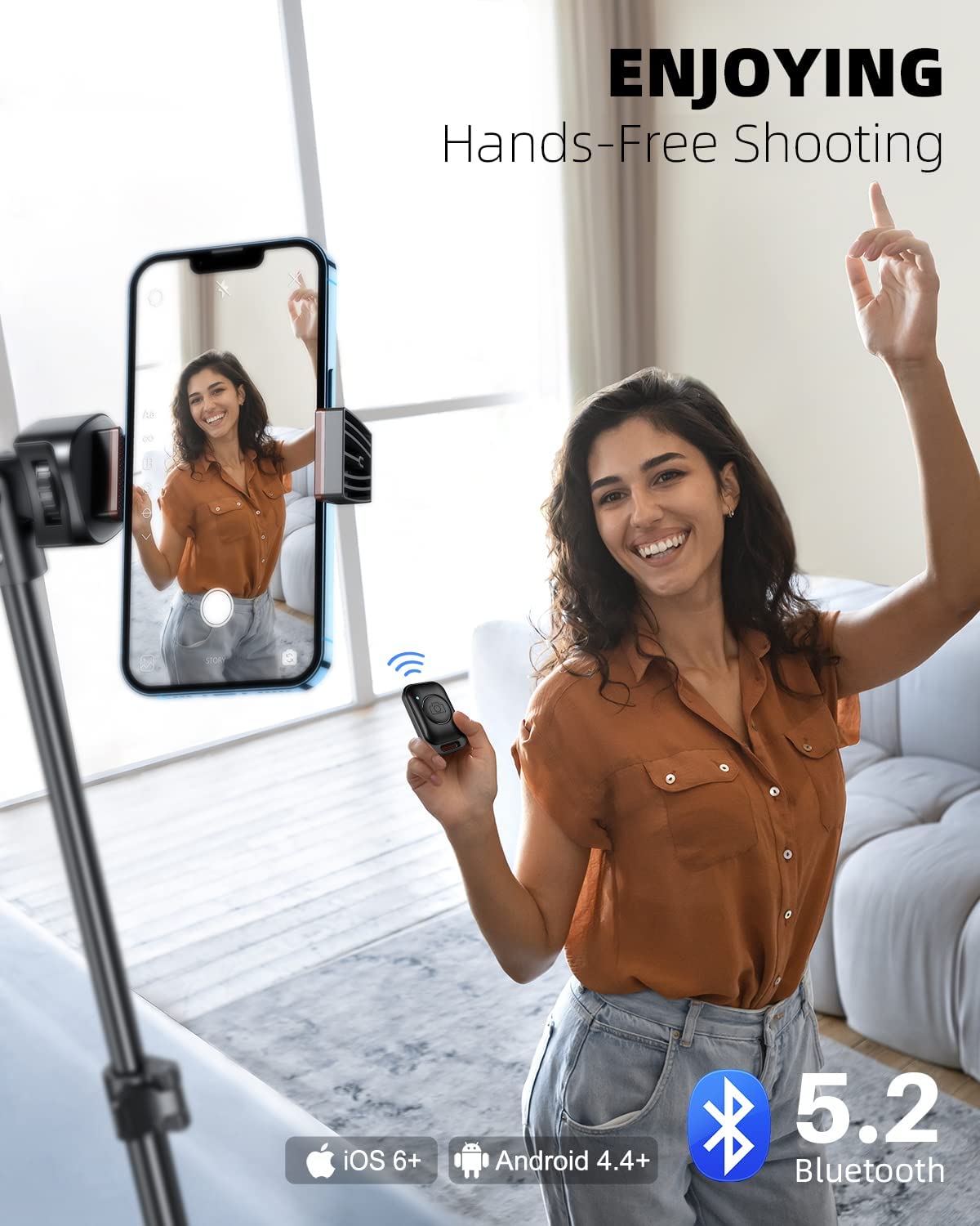- Wireless Shooting, Free Creation: With updated sensor chip, the wireless clicker can connect to your phone in 1 second, no traditional disconnecting problem. Taking satisfying photos and videos within 33ft/10m is piece of cake with this cell phone tripod.