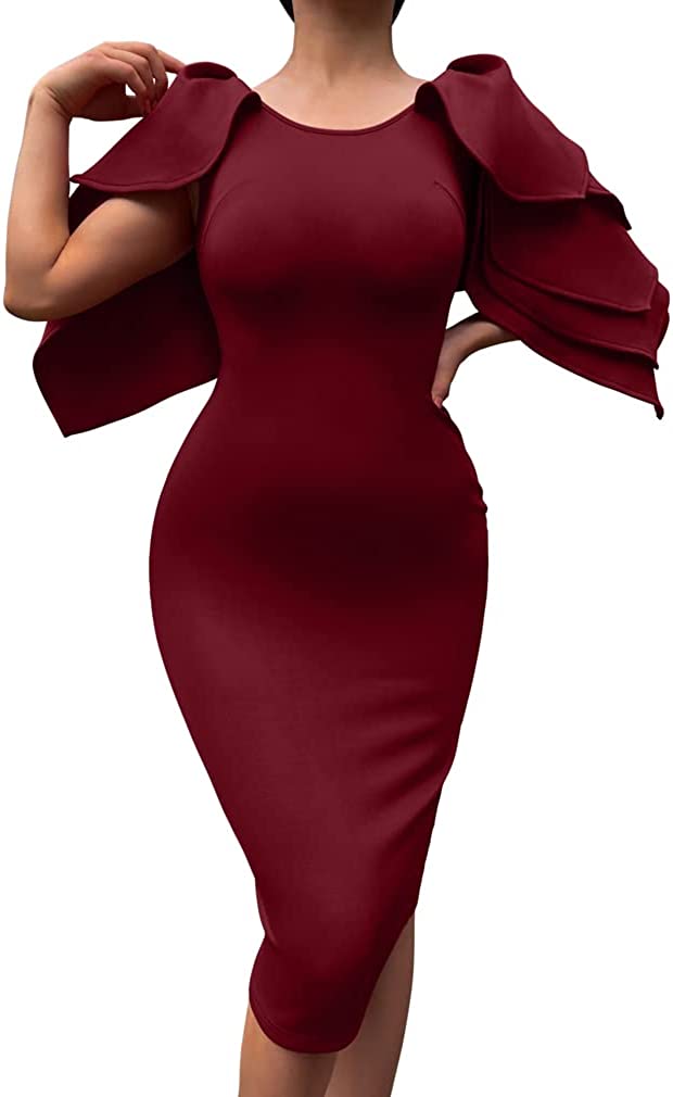 Concealed zipper at side,so it is easy to put on and off .the ruffle sleeves very elegant,and knee-lengh pencil dress as glove wrap you,it is so sexy.