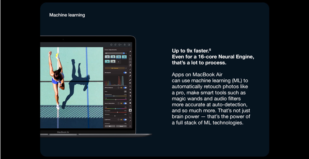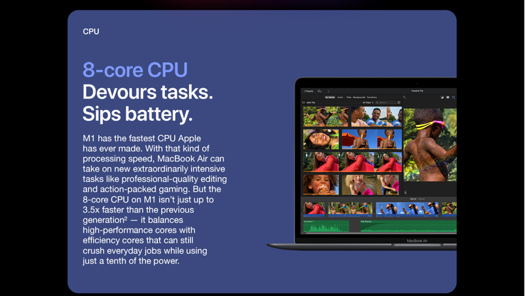 | Processor | System on Chip (SoC) Apple M1 chip; 8-core CPU with 4 performance cores and 4 efficiency cores; 16-core Neural Engine |