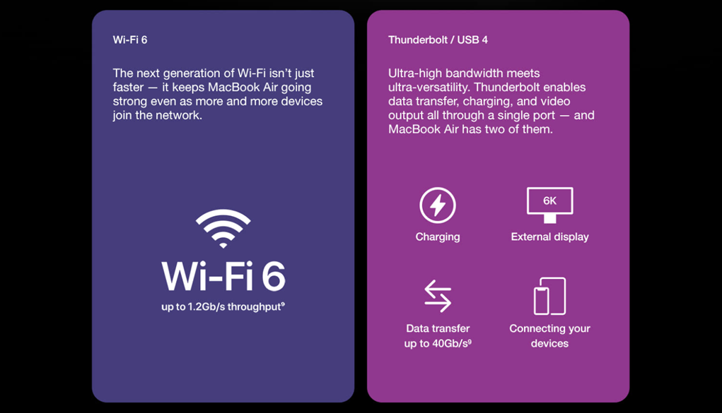 | Charging and Expansion | Two Thunderbolt / USB 4 ports with support for: Charging, DisplayPort, Thunderbolt 3 (up to 40 Gbps), USB 3.1 Gen 2 (up to 10 Gbps) |