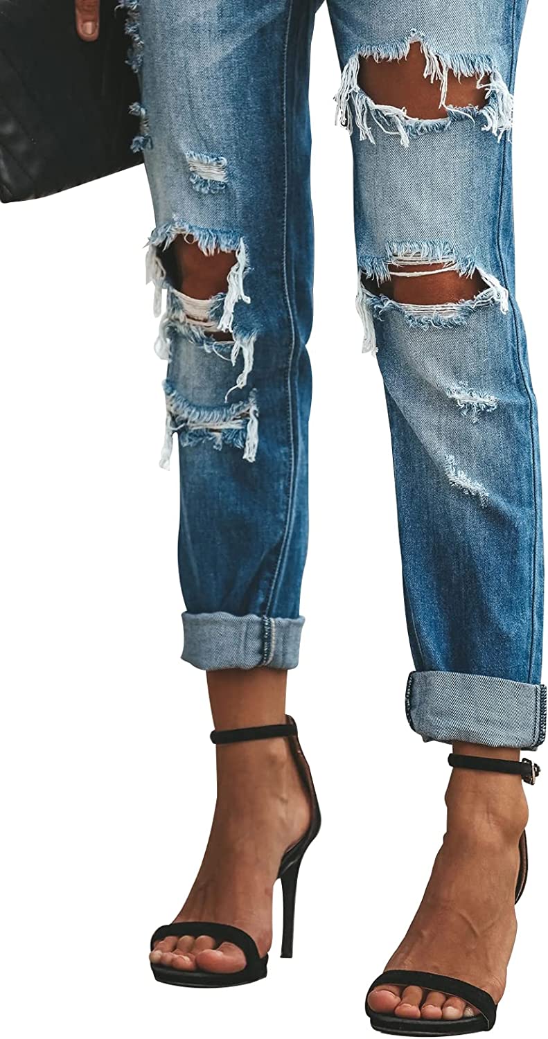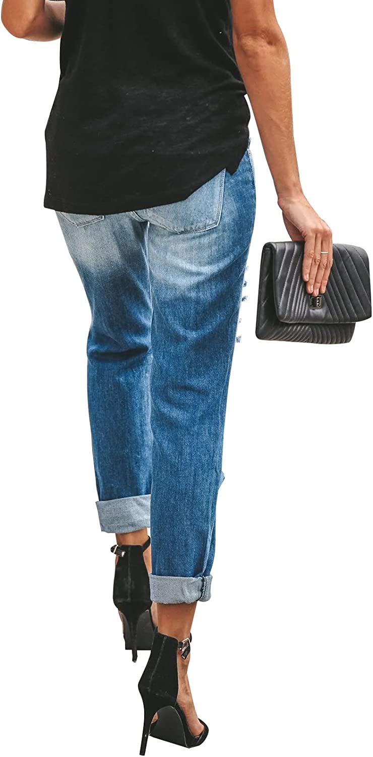 • Casual relaxed fitting jeans with ripped detailing, 5 traditional pockets, zip fly and button closure. Ripped denim jean pants for women with soft, breathable, durable and stretchy denim fabric for everyday comfort.