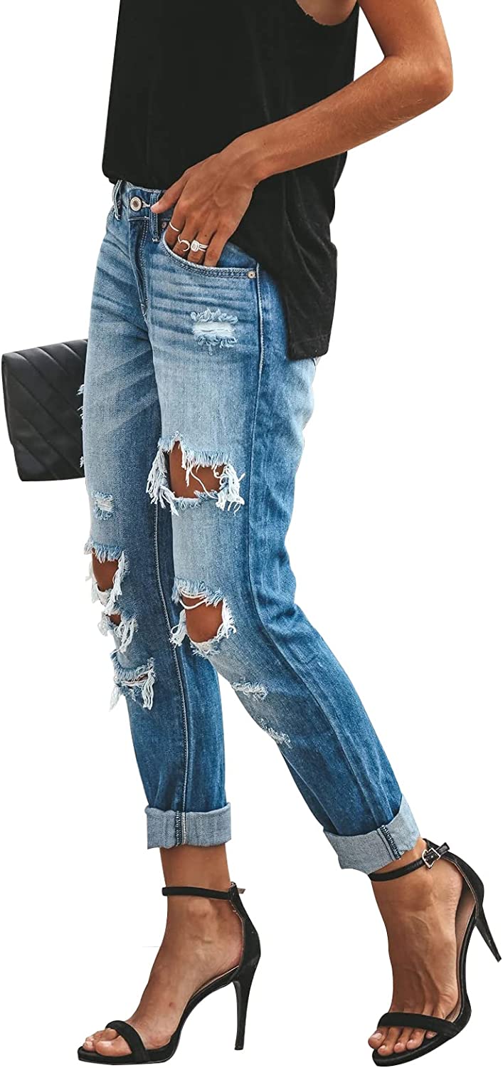 KUNMI Women's Ripped Mid Waisted Boyfriend Jeans Loose Fit Distressed Stretchy Denim Pants