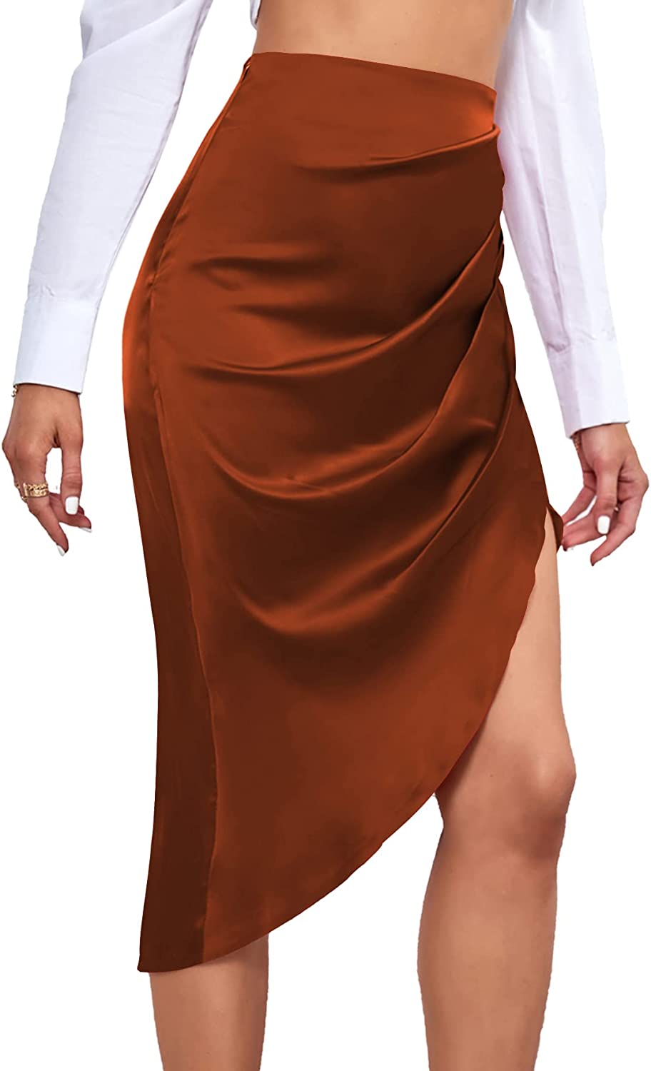LYANER Women's Satin Skily Asymmetrical Split Slit Ruched Hight Waist Bodycon Midi Skirt
