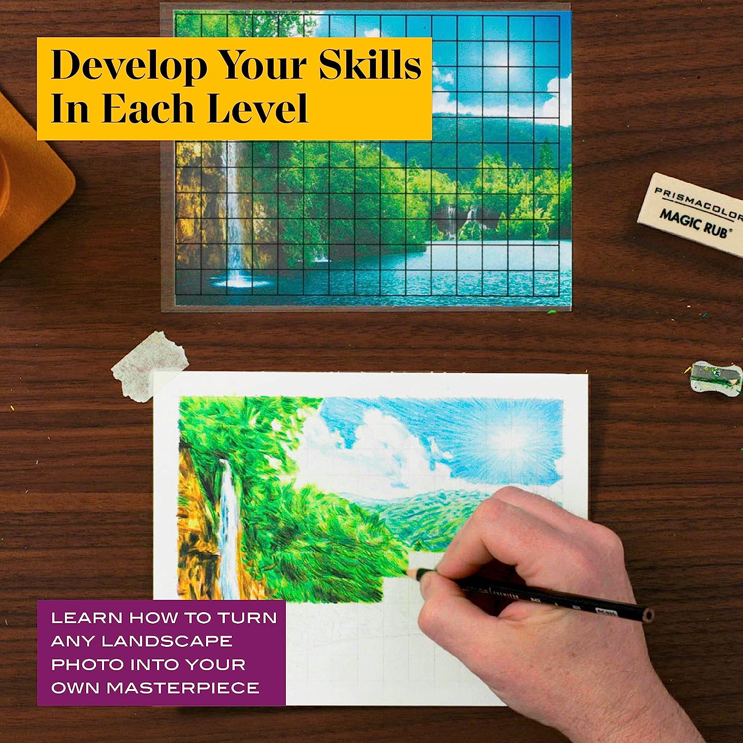 Learn art at your own pace from the comfort of home with Prismacolor Technique. Each Prismacolor Technique set features a unique coupon code for access to digital art lessons you can’t get anywhere else. Instructed by Prismacolor artists, each lesson will teach you how to use the professional-grade art supplies included in the set to create a piece of art you will cherish. The Level 3 Nature Drawing Set is designed for those who have built up some skill and confidence in art. You’ll learn how to take your skills to the next level by recreating any landscape or nature photo using reference grids. The set features Prismacolor colored pencils with rich cores for smooth color laydown and an artist roll case so you can store and carry your art tools. You’ll also receive graphite pencils, a clear reference grid overlay, a colorless blender, an eraser, a drawing pad, a mini sharpener, a drawing template with grid, a set of instructions, and hours of online content to learn at your convenience!