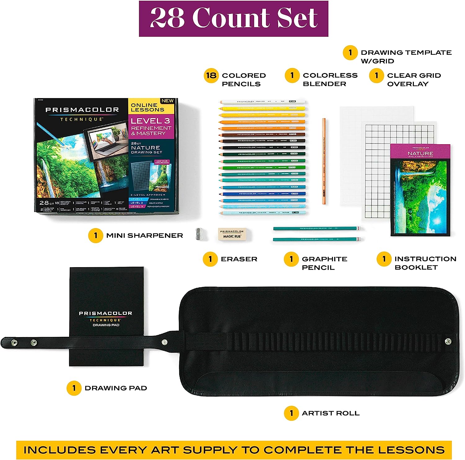 Prismacolor Technique, Art Supplies and Digital Art Lessons, Nature Drawing Set, Level 3, Learn to Draw with Colored Pencils, and More, Includes Artist Roll Case, Waterfall Landscape Drawing, 28 Count