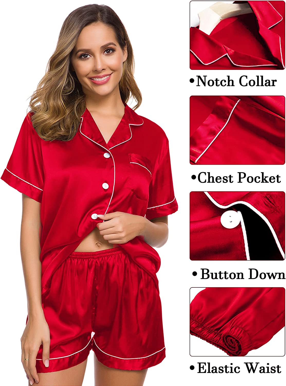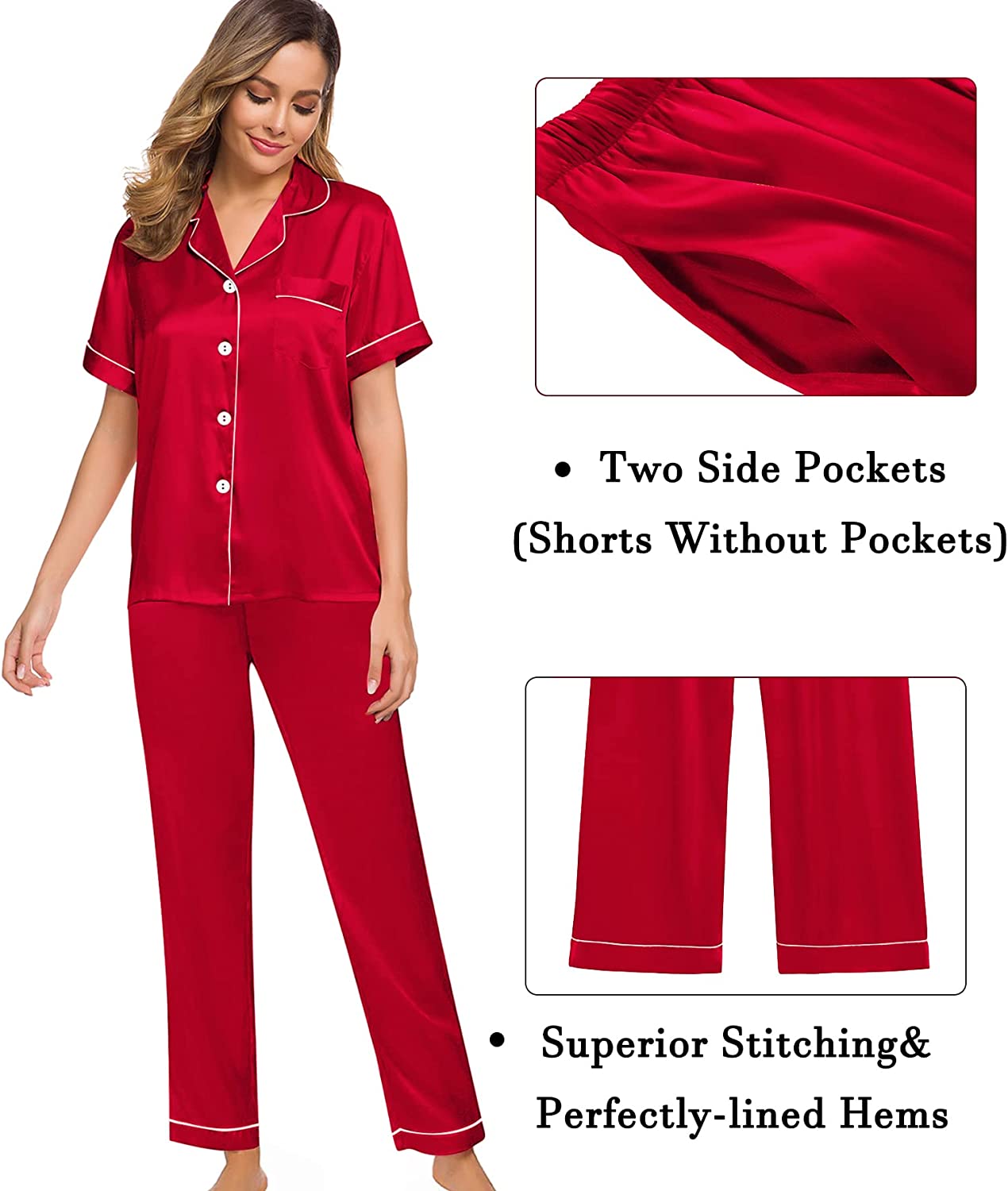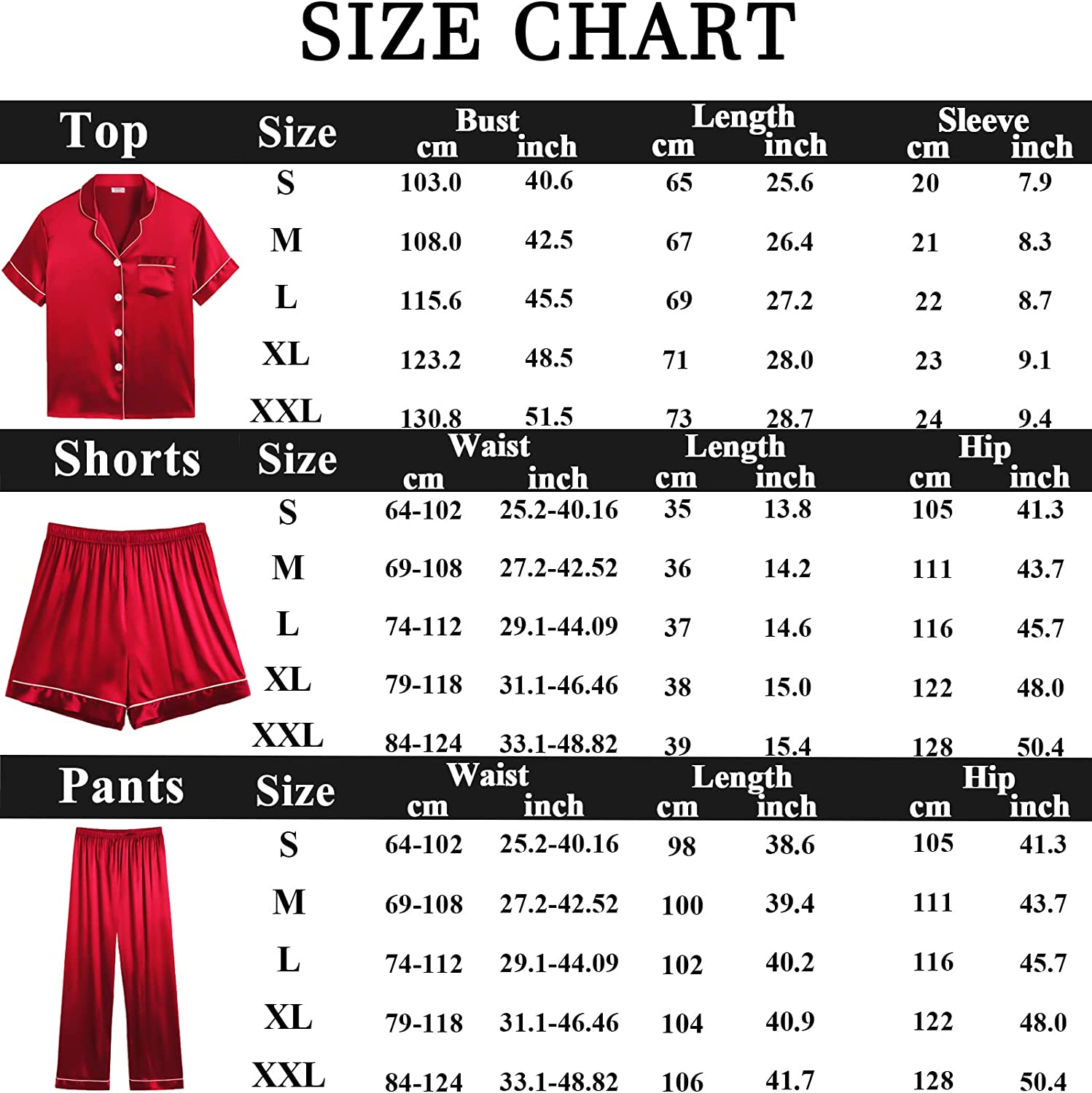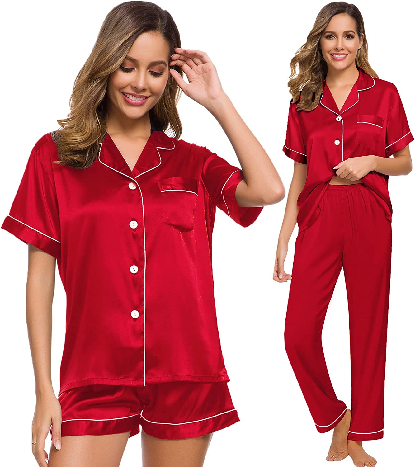• 3PCS PAJAMA SET FOR WOMEN: Women's silk satin pajamas set comes with comfy short sleeve pajamas shirt, silky shorts, a pair of drawstring elastic waist pants. Classic short sleeve silk pajama set, you can match this sleepwear in differnt way to meet your needs all year around.