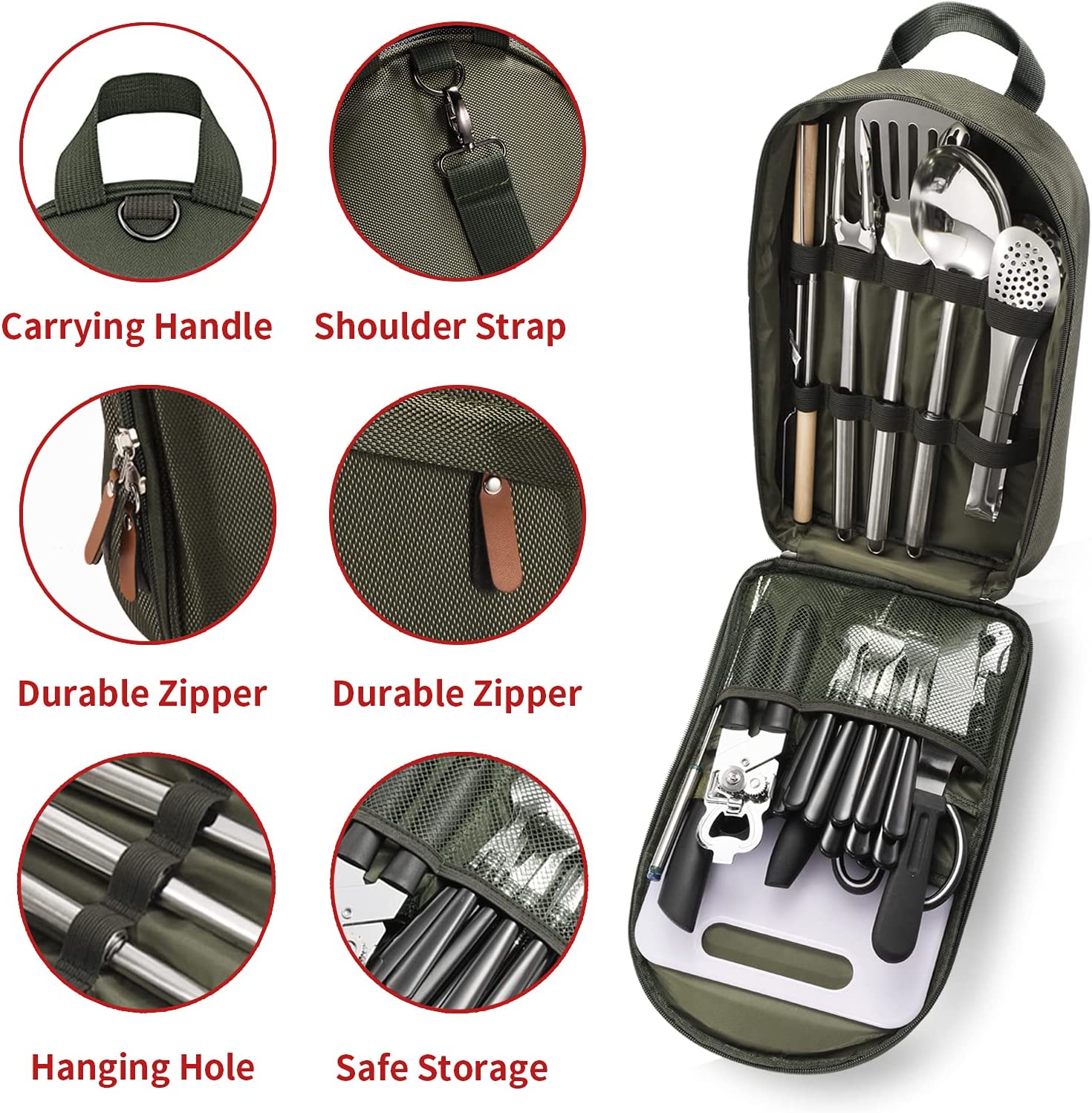 | Included Components | 1*storage bag, 1*cutting board, 1*barbecue fork, 1*slotted tongs, 1*paring knife, 1*chef's knife, 1*wine opener, 1*can opener, 1*ladle, 1*scissors, 1*scraper, 1*slotted turner, 2*barbecue skewers, 2*extendable BBQ forks, 4*flatware cutlery set(3pcs), bag. |