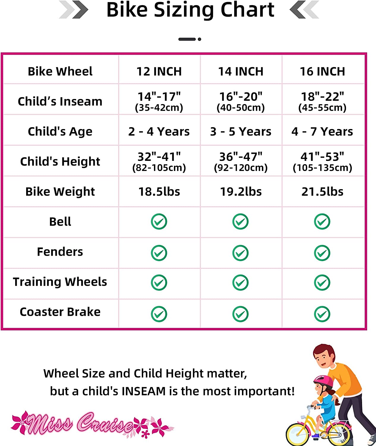 • SIZE CHART & OUR GUARANTEES-12 inch toddler bike is suitable for 2-4 years old (33-41 inch) boys & girls; 14 inch bike is suitable for 3-5 years old (35 - 47 inch); 16 inch kids bicycle is suitable for 4-7 years (41-53 inch). Adult assembly is required. The kid bike comes with 85% assembled body and the basic assembly tools, timely customer service and also limited lifetime warranty.