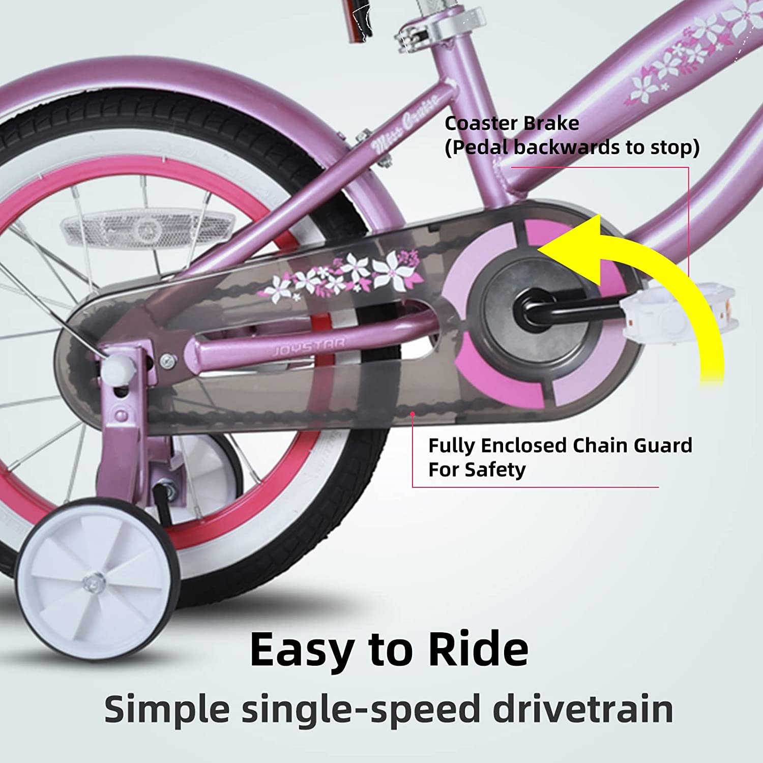 • SAFE FOR YOUNG RIDER-Coaster brake is easy to provide phenomenal stopping power when needed, so they can stay in full control, a great option for young rider. Enclosed chain guard, prevent your kids getting hurt. Removable training wheel will keep everything pointing in the right direction till she's ready to balance on her own.