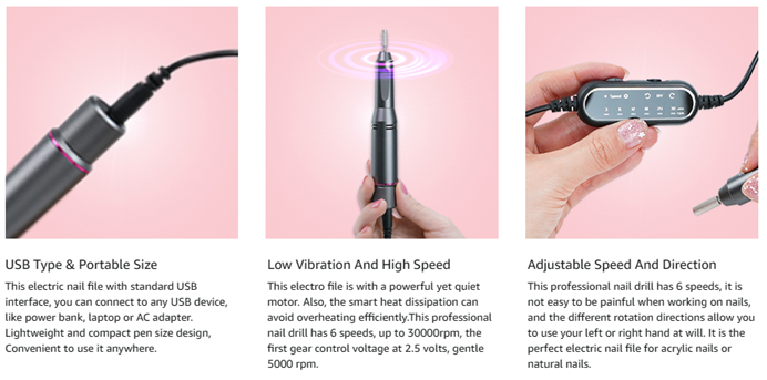 Portable & Durable: Thanks to its compact and lightweight full-metal design. Fuegobird electric nail drill set is easy to carry with, allowing you to do nail art anytime, anywhere. You can power it with any USB socket, such as a power bank, laptop, or AC adapter.