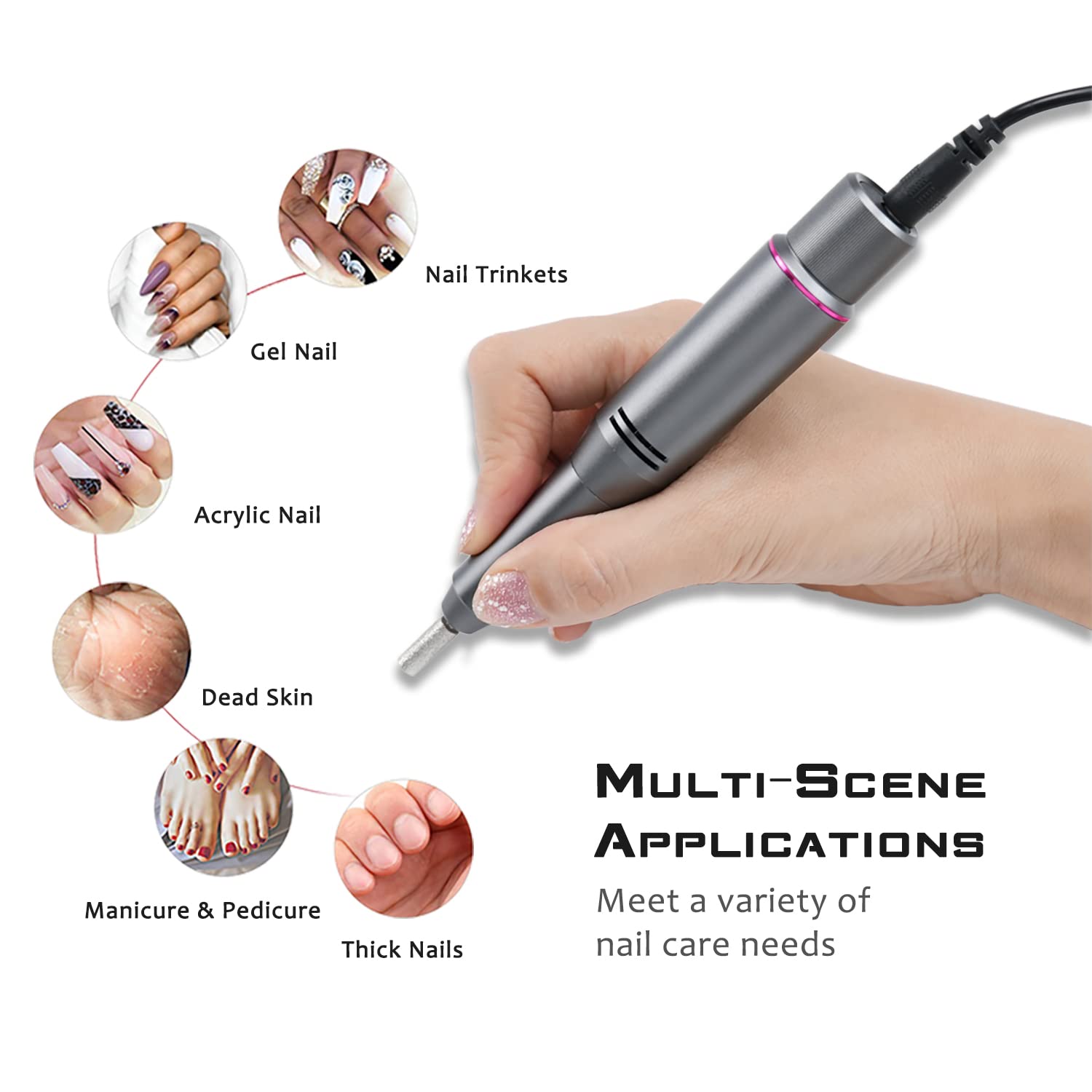Multifunctional & Portable Nail Drill Kit: Experience versatile nail care with this powerful electric nail drill kit. With Fuegobird electric nail drill, you can shape, buff, grind, polish, and remove acrylic, poly gel, artificial, thick, builder gel, dip powder, fake, and natural nails, as well as dead cuticles with ease. Suitable for manicure and pedicure beginners and pros.