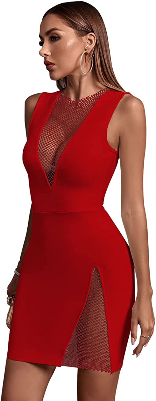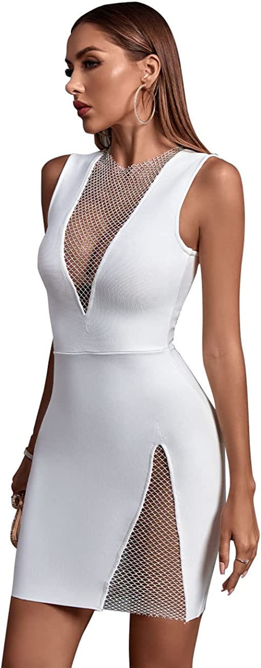 • Features:Bandage dress with side split design,ubique waistline detail,plunge v neck,bodycon tight fit,embellished with mesh and rhinestones on the chest and legs,sleeveless and flattering mini length cut