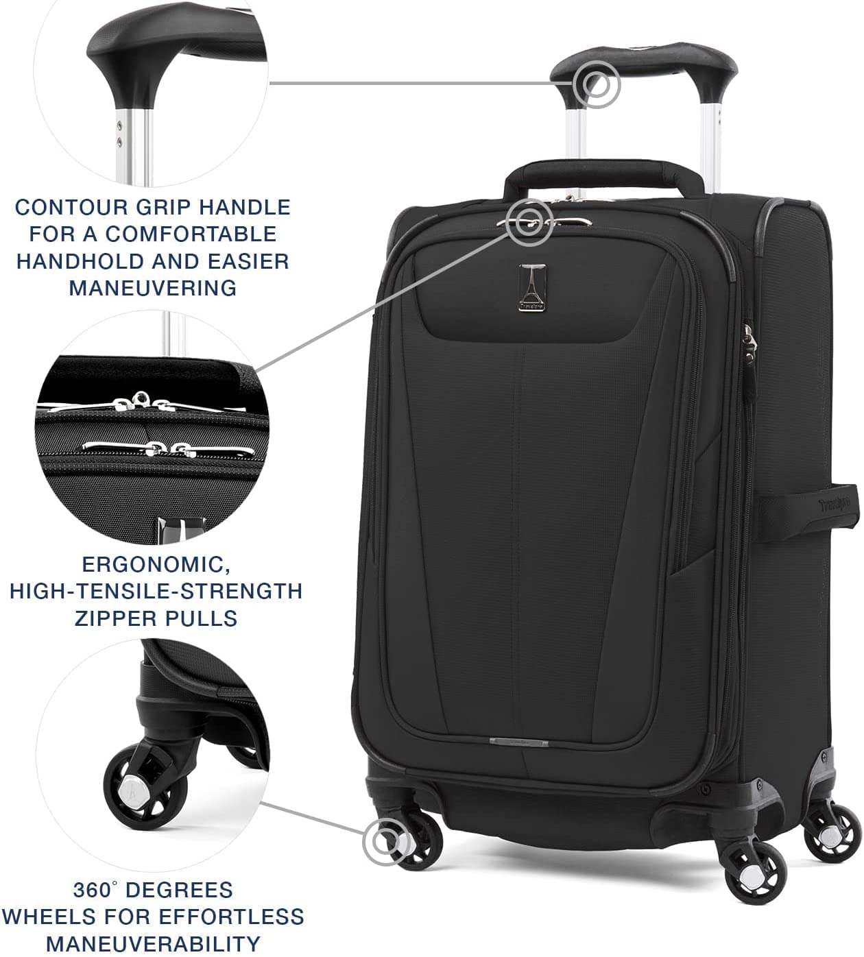 This carry-on soft-sided spinner is so light, it flies; one of our lightest wheeled carry-on suitcases, the Maxlite 5 21" expandable spinner is designed for ultimate comfort and mobility, featuring a 2-position adjustable PowerScope lite handle with patented Contour grip and 4-wheel 360 degree rotating spinners that glide effortlessly. Enjoy packing convenience with two quick-access, exterior front pockets, full-length interior lid pocket, side accessory pocket and adjustable hold-down straps, while the high-tensile-strength expandable zipper gives you maximum packing flexibility. Backed by a new and expanded trusted traveler promise-for worry-free warranty coverage from Travelpro.
